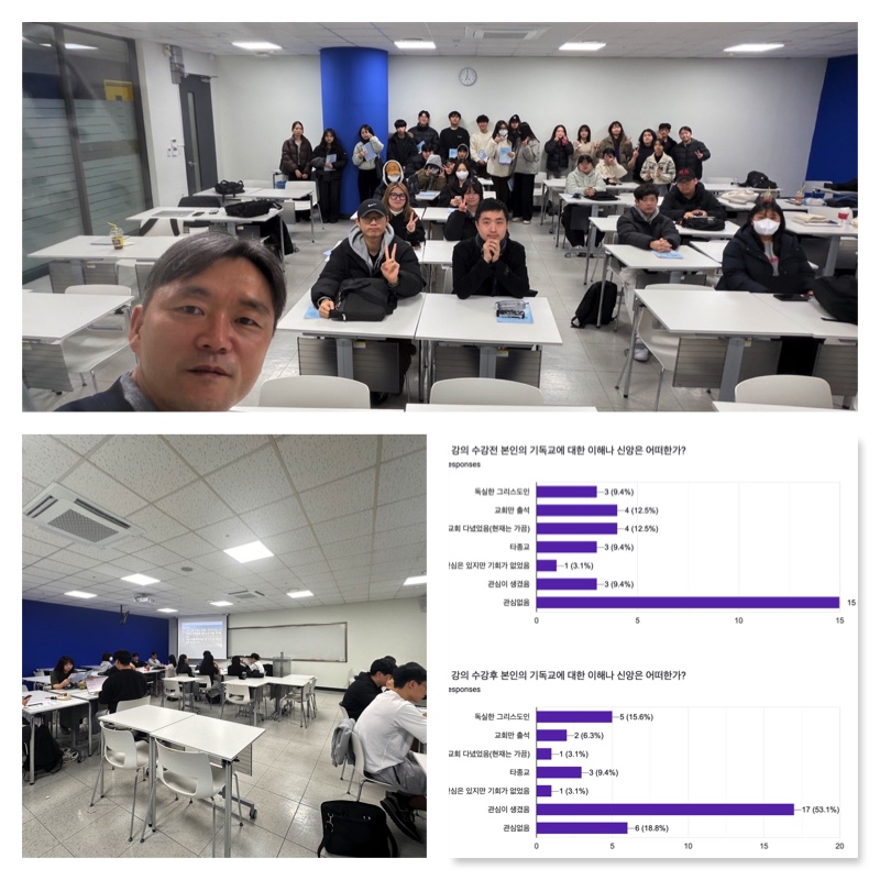 이번 학기 동안 좋은 강의를 들을 수 있어 감사했습니다. 기독교 수업이 단순한 지식 전달이 아니라 제 삶을 되돌아보게 하는 시간이 되었습니다. 앞으로도 학생들이 편하게 질문하고 생각을 나눌 수 있는 수업 분위기를 계속 이끌어주시면 좋겠습니다. 감사합니다.