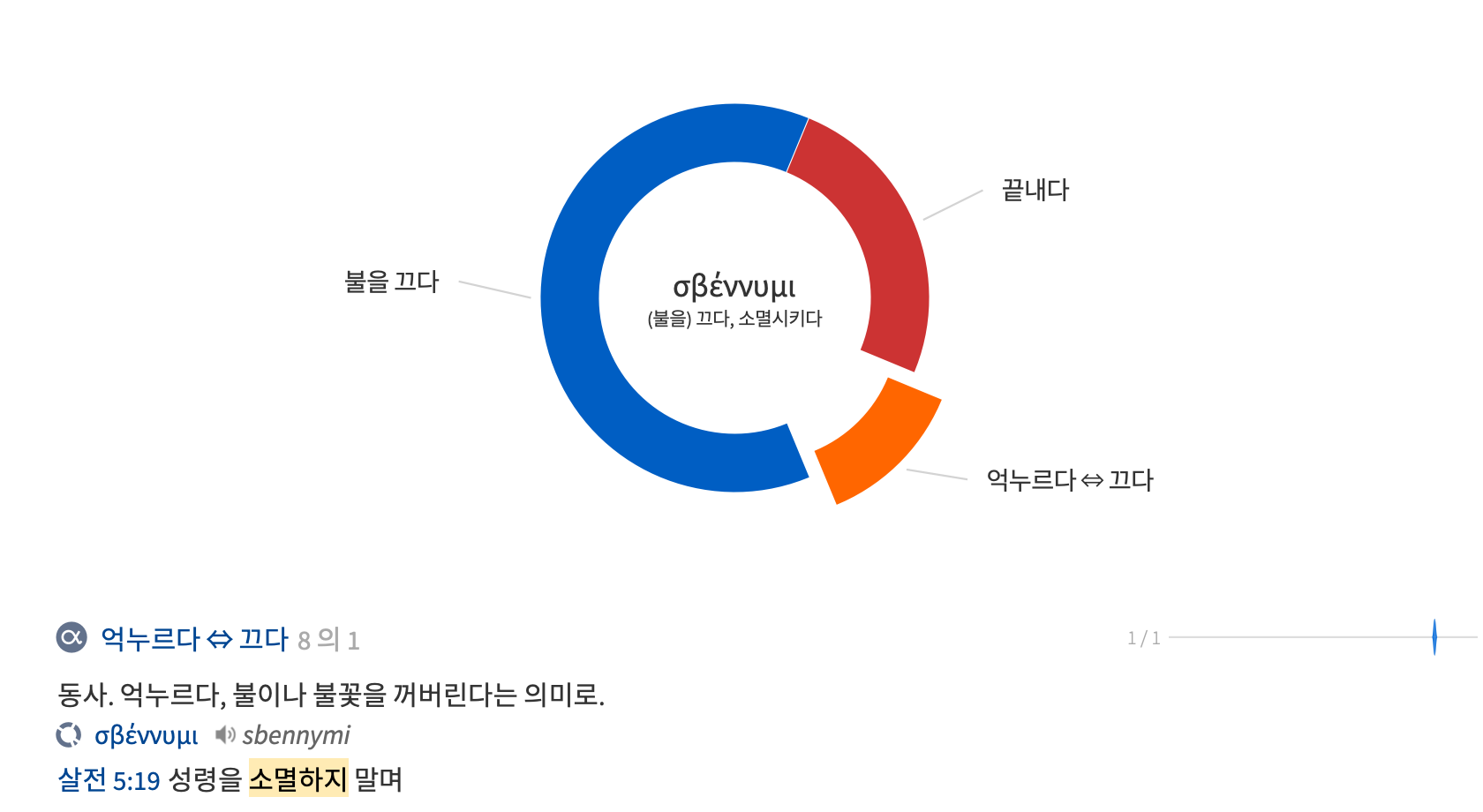 - σβέννυμι (sbennymi), 동사. (불을) 끄다, 소멸시키다. 미래 능동태. σβέσσω; 부정과거 능동태. ἔσβεσα; 부정과거 능동태. ἐσβέσθην; 완료 중간태. ἔσβεσμαι. 히브리어 등가: כבה (10).