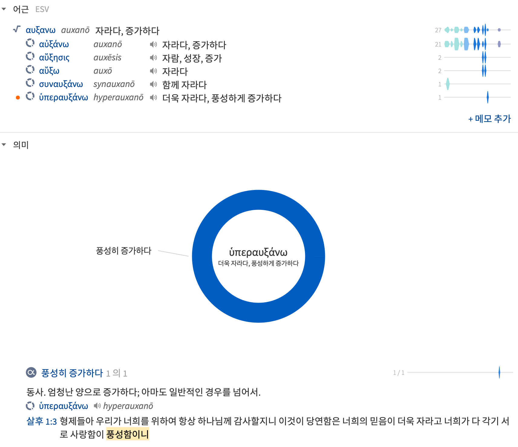 본문에서 ‘더욱 자라고’라는 표현은 ‘휘페라욱사네이’으로 이것의 원형 ‘휘페라욱사노’는 ‘~을 초과하여’라는 의미를 지닌 ‘휘페르’와 ‘자라다, 번성하다’라는 의미를 지닌 ‘아욱사노’의 합성어로 ‘지나치게 증가하다, 엄청나게 자라다’라는 강한 의미를 지닌다. 이 표현은 신약성경에서 이곳에서만 사용된 표현이다. 데살로니가 교회는 바울이 상상한것 이상으로 하나님에 대한 믿음이 급속도로 자라간 것이다. 또한 이 표현은 현재 시제 직설법으로 성장이 멈추지 않고 지금도 계속되고 있음을 강조한다. 이를 ESV는 ‘is growing abunduntly’로, NIV는 ‘is growing more and more’로 번역했다. 멈추지 않고 지속적으로 성장하는 믿음, 이것이야말로 하나님이 기뻐하실 일이며 목회자에게 있어서 가장 감사할 일이다.