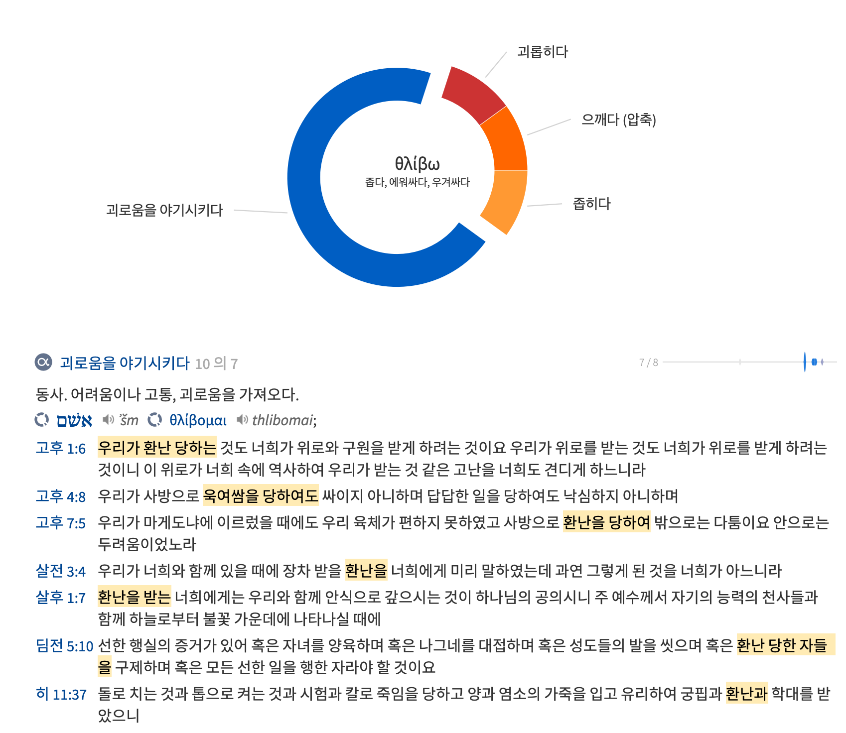 본절에서 '환난을 받게하는’이라는 표현은 ‘들리부신’은 ‘들리보’의 현재 분사 능동태 표현이다. ‘들리보’는 원래 포도를 짓눌러 즙을 짜내는 것을 의미하는 표현이다. 신약에서는 사람을 말할 수 없는 고통으로 압박한다는 의미로 비유적으로 사용되었다. 성도들에게 이러한 고통을 가하는 자들을 하나님께서는 동일한 환난으로 갚으실 것이다.
