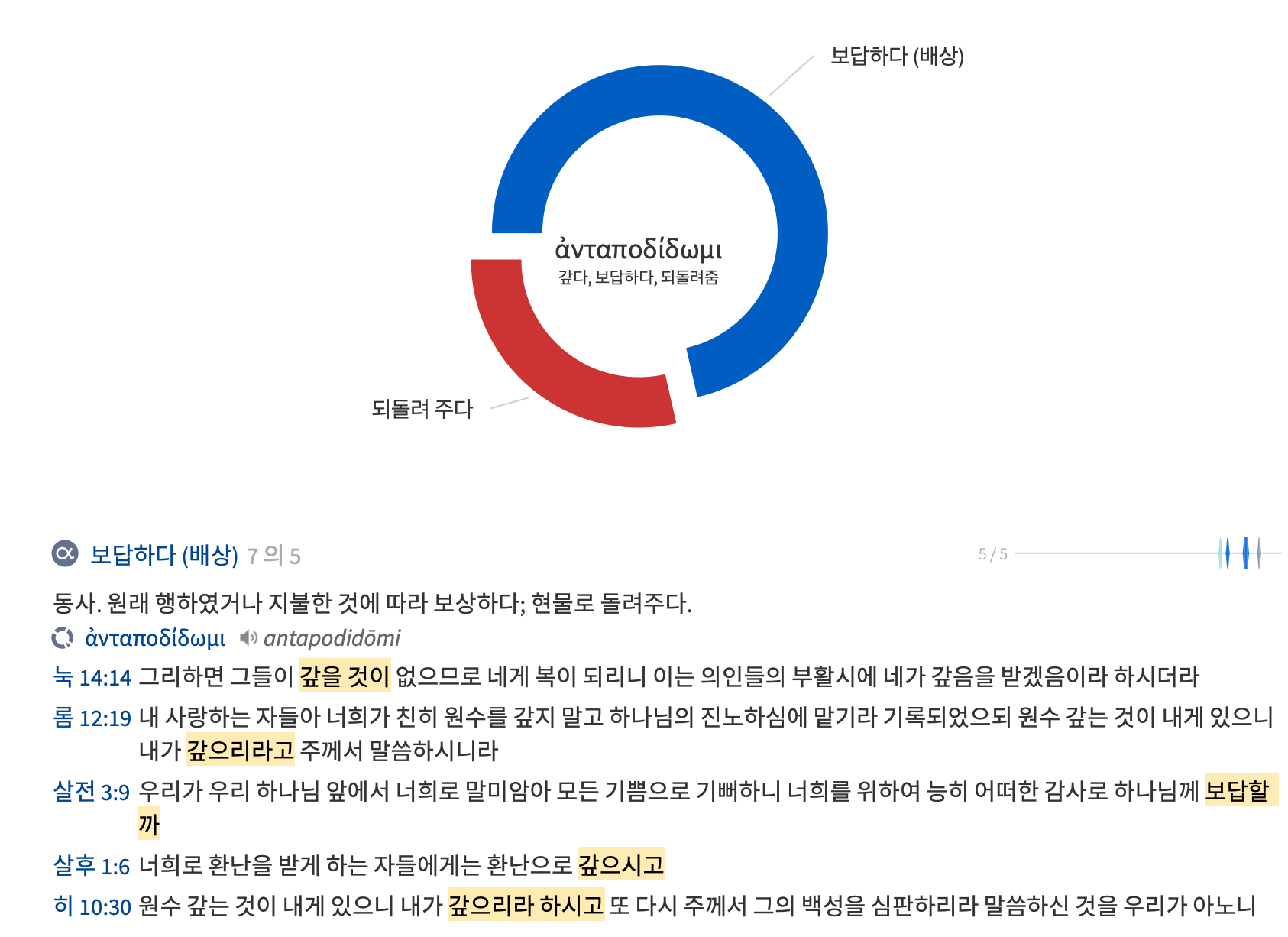 ‘갚으시고’로 번역된 ‘안타포두나이’의 원형은 ‘안타포디도미’로 ‘~에 대하여’를 의미하는 전치사 ‘안티’와 ‘되돌려주다’를 의미하는 동사 ‘아포디도미’의 합성어로 되돌려주어야 할 것을 있는 그대로 되돌려주는 것을 의미하는 표현이다. 하나님께서는 악에 보응하시며 선한 행실에 대해서도 갚으시는 분이시다. 우리가 이 땅에서 행하는 모든 일들에 대한 선과 악에 대해서 하나님께서는 공의로 상과 벌로 보응하시는 분이시다. 하나님께서 이렇게 공의로 보응하신다는 믿음은 환난을 당하는 우리에게 큰 위로가 된다.