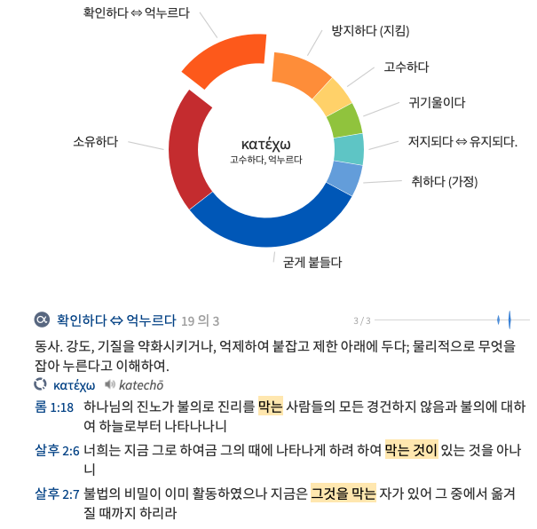 κατέχω (katechō), 동사. 고수하다, 억누르다. 미래 능동태. καθέξω; 부정과거 능동태. κατέσχον; 완료 능동태. κατέσχηκε; 부정과거 능동태. κατεσχέθη; 완료 중간태. κατέσχηνται. 히브리어 등가: אחז 1 (5). 아람어 등가: חסן (1).