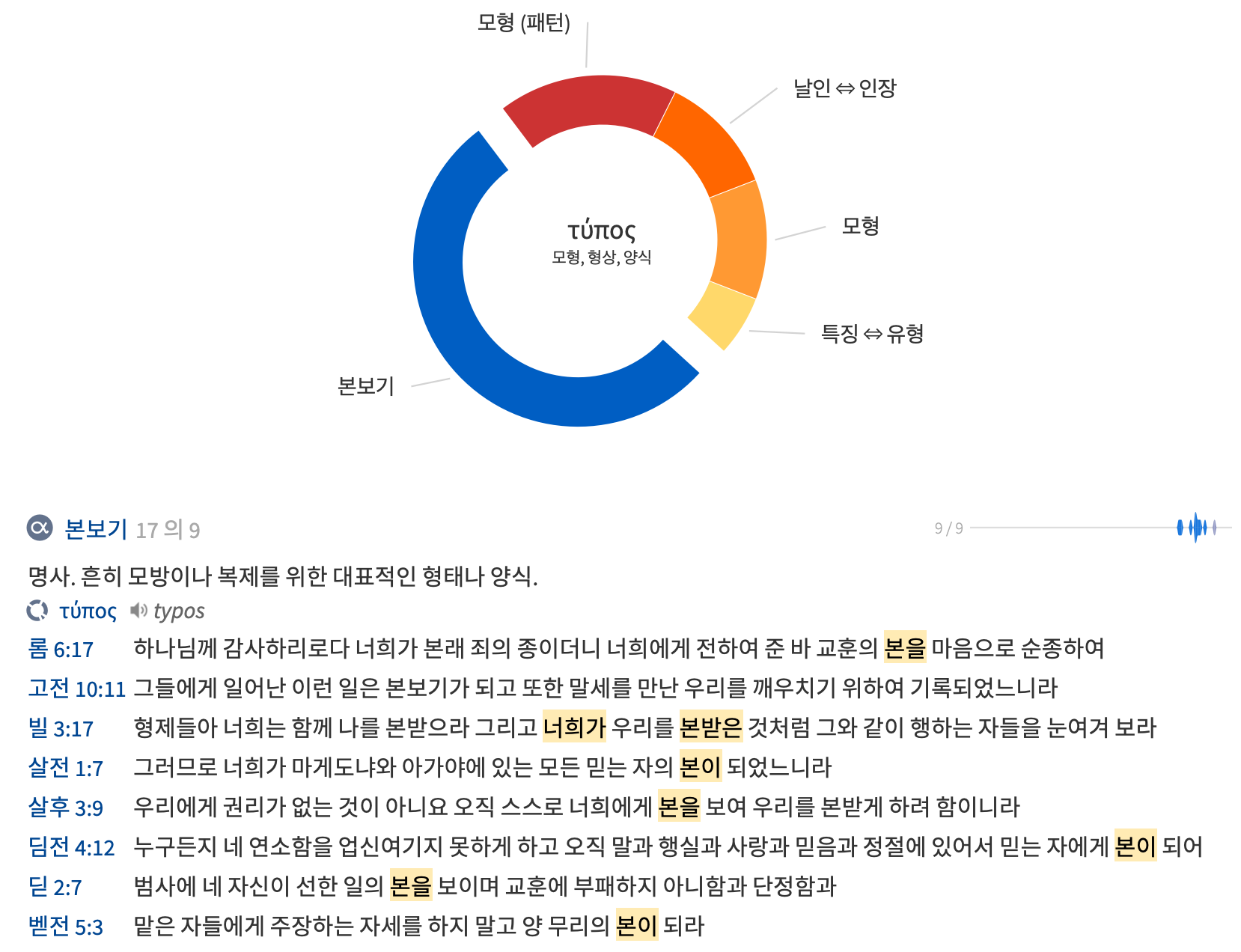‘스스로 너희에게 본을 보여’는 ‘헤아우투스 튀폰 도멘’으로 ‘우리 스스로를 본으로 주어’라는 의미이다. ‘본’에 해당하는 ‘튀폰’의 원형은 ‘튀포스’로 이것에서 파생된 것이 영어로 ’type’이다. 이는 ‘모형, 형상, 양식, 본보기’라는 의미이다.