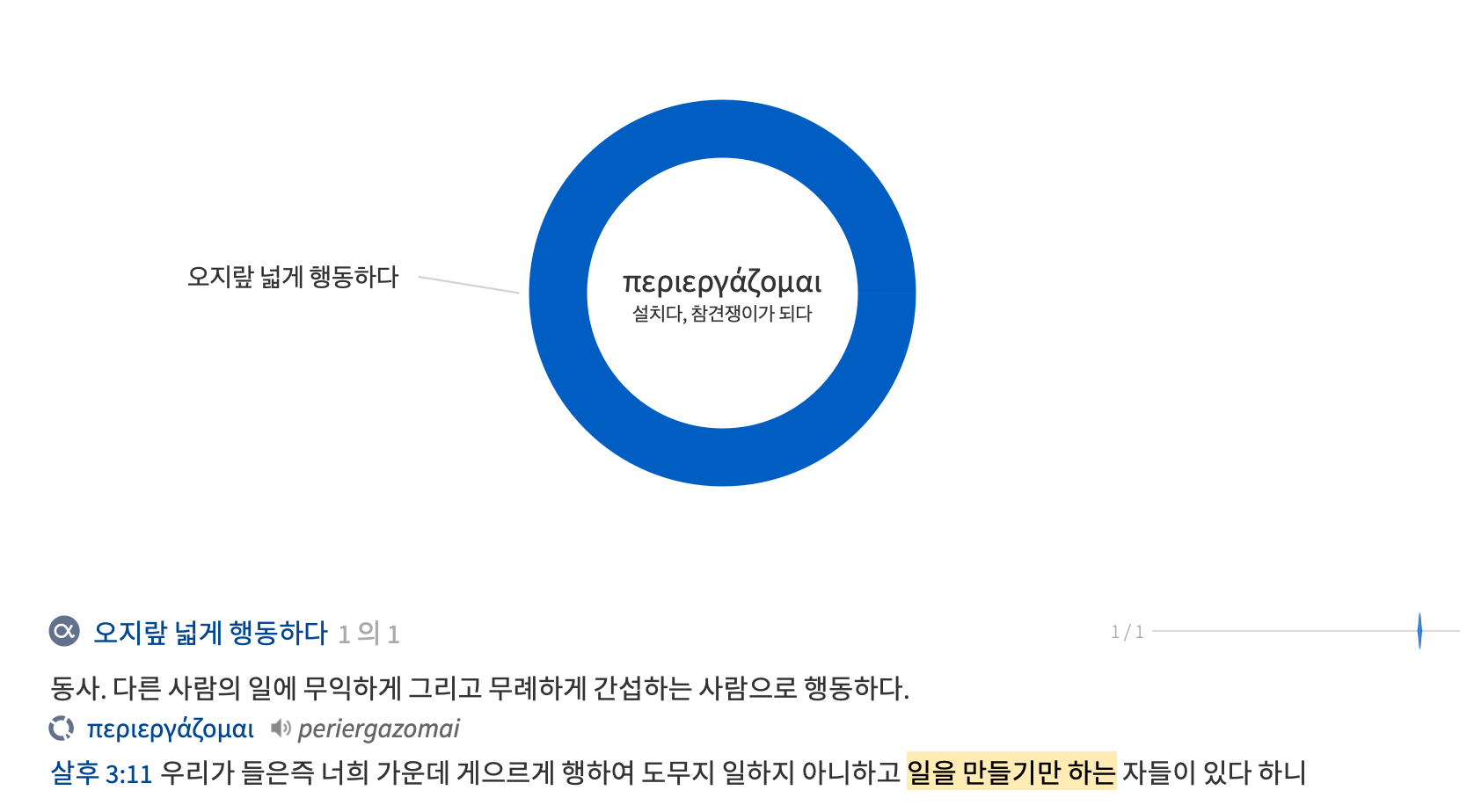 ‘일하지 아니하고 일을 만들기만 하는 자들이 있다하니’, 앞서 10절에서 일하기 싫어하는 이들이 있었다면 본절 11절에서는 한걸음 더 나아가 일을 만드는 이들이 있었다. ‘일하다’는 ‘에르가조마이’인데 이는 ‘행위, 행실, 일’을 의미하는 ‘에르곤’의 동사형이다.