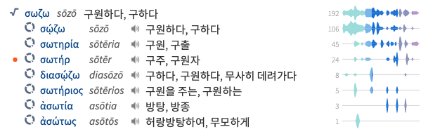 - σωτήρ -ος, ὁ; (sōtēr), 명사. 구주, 구원자. 히브리어 등가: יֵ֫שַׁע (10), יְשׁוּעָה (4), מוֹשִׁיעַ (4).