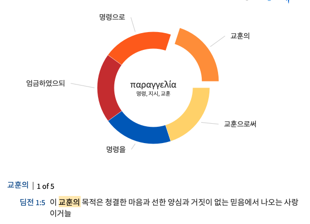 5절) 한글 성경은 번역하지 않았지만 원문은 그러나 라는 접속사 ‘데’가 사용되었다. KJV은 이를 Now(이제)로 번역한다. 본문에서 교훈으로 번역된 ‘파랑겔리아스’는 앞선 3절에서 명하여로 번역된 단어이다. 이는 어떤 것을 하도록 하는 명령이나 훈령에 대한 공적인 진술을 의미한다. 이전 한글 개역 성경은 이 표현을 ‘경계’라고 번역하였다. 이 교훈, 명령은 바로 바울이 에베소 교회의 성도들을 향해서 명하고 가르쳐야하는 중요한 가르침을 의미하는데 이 가르침의 목적은 바로 사랑(아가페)이다.