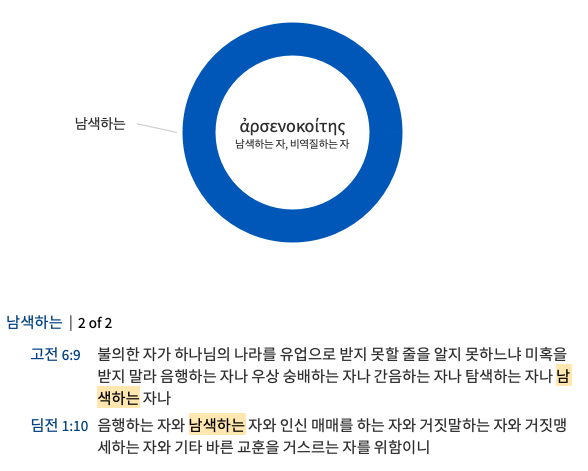 남색하는 자로 번역된 ‘아르세노코이타이스’의 원형 ‘아르세노코이테스’는 남자를 의미하는 ‘아르센’과 눕다, 자리잡다를 의미하는 ‘케이마이’의 합성어로 남자들끼리의 직접적인 동성 연애를 지칭한다.