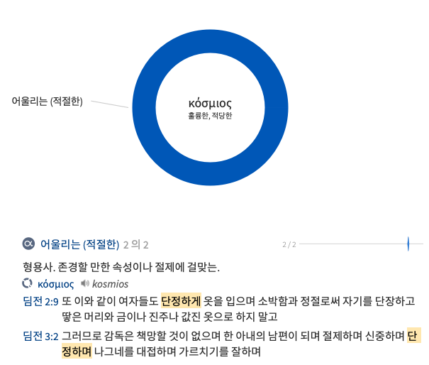 ‘여자들도 단정하게 옷을 입으며’, 바울은 먼저 단정하게 옷을 입을 것을 요구한다. 본문에서 ‘단정하게’로 번역된 ‘코스미오’의 원형 ‘코스미오스’는 신약에 2번 등장하는 표현으로 ‘존경할 만한 속성이나 절제에 걸맞는, 아담한, 단정한’의 의미이다. 본절에서는 외모를 표현했고 딤전 3:2에서는 사람의 성품과 관련해 ‘행동이 선한, 질서가 잡힌’의 의미로 사용되었다. ‘코스모스’라는 명사는 ‘세상, 장식’이라는 의미인데 여기서 화장품을 의미하는 ‘cosmetic’이라는 단어가 파생되었다.