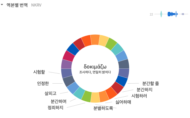 δοκιμάζω (dokimazō), 동사. 조사하다, 면밀히 밝히다. 미래 능동태. δοκιμάσω; 부정과거 능동태. ἐδοκίμασα; 완료 능동태. δεδοκίμακας; 부정과거 능동태. ἐδοκιμάσθην; 완료 중간태. δεδοκιμάσμεθα. 히브리어 등가: בחן (10), חקר (2), יקר (1), מַצְרֵף (1).