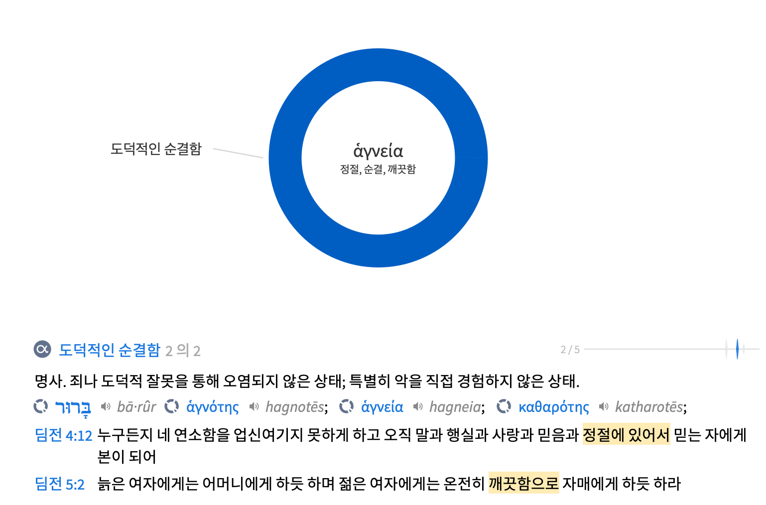 다섯째 ‘정절’이다. ‘하그네이아’는 본래 ‘깨끗한, 정결한, 순전한”이라는 의미의 ‘하그노스’에서 파생된 명사로 ‘정결, 순결, 깨끗함’을 의미하는데 사상과 행위에 있어서, 도덕적으로나 종교적으로 철저한 순결을 의미한다. 여기에서 ‘하기오스’ ‘거룩한 자, 성도’라는 표현이 나왔다.