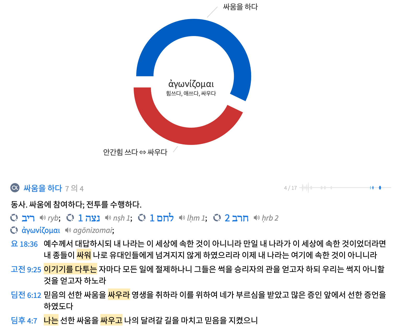 12절) ‘믿음의 선한 싸움을 싸우라’, ‘싸우라’로 번역된 ‘아고니주’는 본래 ‘싸우다, 힘쓰다’를 의미하는 동사 ‘아고니조마이’의 현재 명령형으로 계속해서 싸우며 힘써야 할 것을 의미한다. 이 표현은 전쟁(요 18:36)이나 운동경기(고전 9:25)를 하는데 모두 사용된다. 바울이 딤후 4:7에서 ‘내가 선한 싸움을 싸우고 나의 달려갈 길을 마치고 믿음을 지켰다’라고 언급한 것을 감안하여 볼때 바울은 이 싸우다라는 의미속에 목숨을 건 전투나 승리를 위하여 최선을 다하는 운동경기라는 중의적 의미를 모두 함축하고 있다.(월드컵, 안와골절 속의 투혼, 손흥민) 이처럼 우리의 믿음의 선한 싸움에는 불굴의 의지와 노력이 필요하다. 이 싸움은 혈과 육에 속한 것이 아니라 믿음의 진리를 고수하기 위한 것이기에 최선을 다하여 생명을 걸 가치가 있는 것이다. 이처럼 바울은 디모데에게 소극적으로 피할 뿐만 아니라 적극적으로 따르며 싸울 것을 명한다.