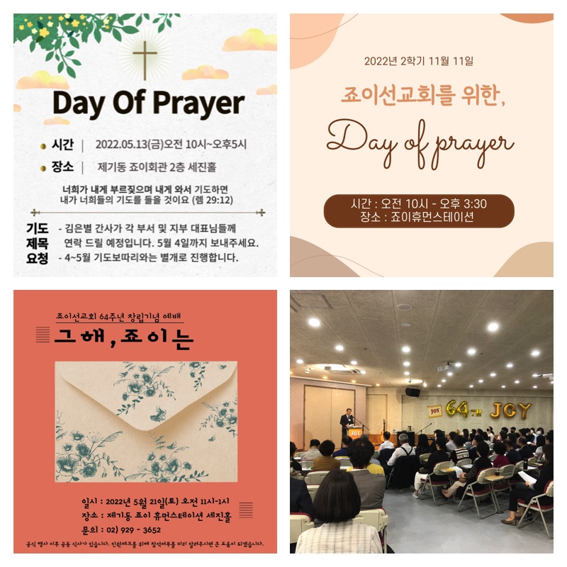 5월 21일에는 죠이선교회 64주년 창립기념예배를 드렸습니다. ‘그해, 죠이는’이라는 주제로 과거 70년대 죠이에서 영어로 진행되던 순서 그대로 모임을 진행했습니다. 그 때에 우리와 함께 하셨던 주님께서 지금도 우리와 함께 하심을 고백하는 귀한 시간이었습니다.