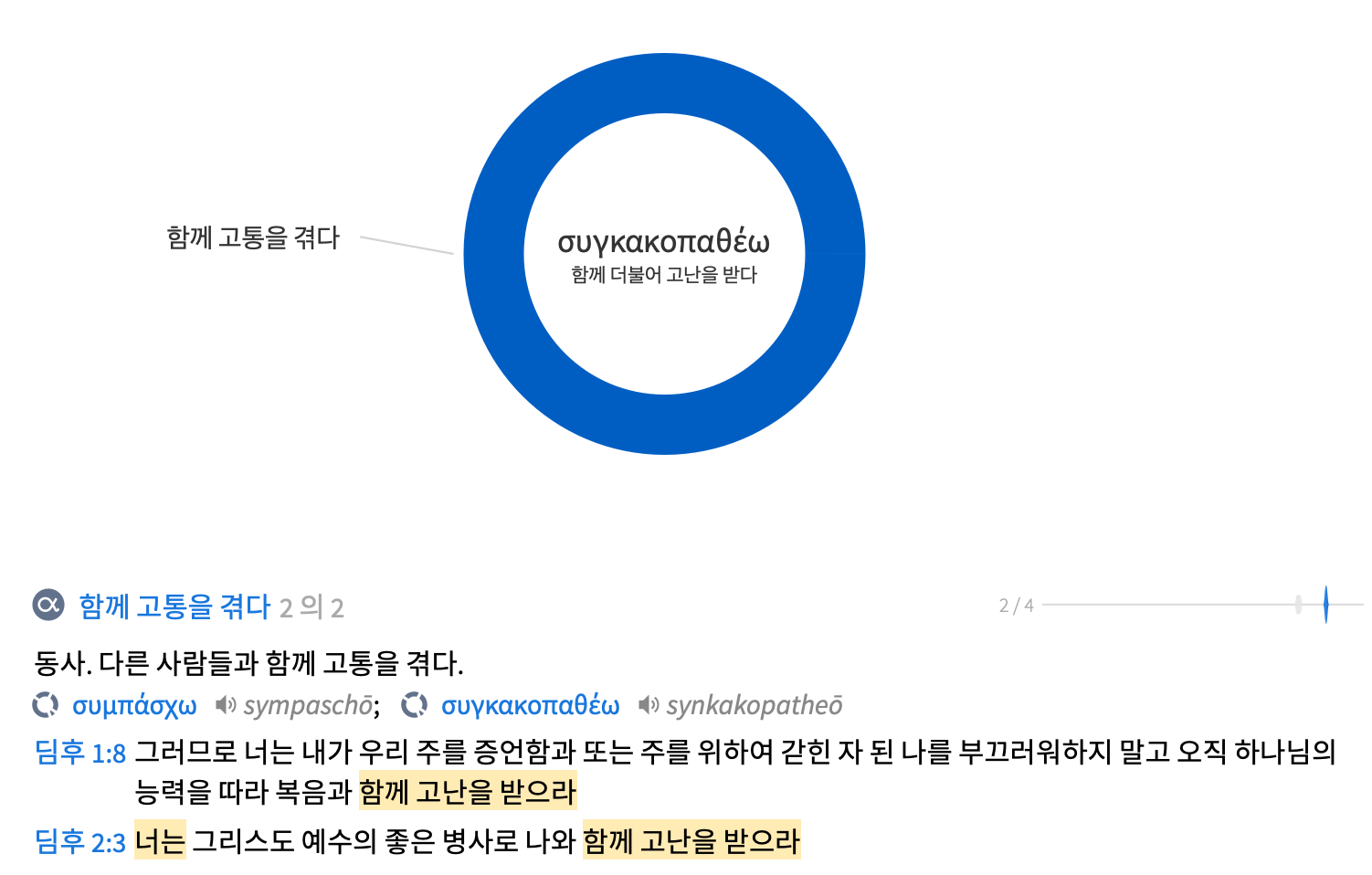 ‘너는 나와 함께 고난을 받으라’로 번역된 ‘슁카코파데손’은 ‘함께’라는 의미를 지닌 ‘쉰’과 ‘나쁘게, 흉악하게’를 의미하는 ‘카코스’, ‘경험하다, 겪다’를 의미하는 동사 ‘파스코’의 합성어로 ‘고난받다, 핍박받다’라는 의미의 동사 ‘카코파테오’의 합성어인 ‘슁카코파테오’의 부정과거 능동태 명령법 표현이다. 원문에서는 디모데가 누구와 함께 고난을 받아야 하는지 분명하지 않다. 이를 한글 번역에서는 임의로 ‘나와 함께, 즉 바울과 함께’ 고난을 받으라고 해석했다. 하지만 2절과 연결해서 생각해본다면 ‘바울을 포함한 많은 증인들과 함께’ 고난을 받으라라고 이해하는 것이 더욱 타당하다.