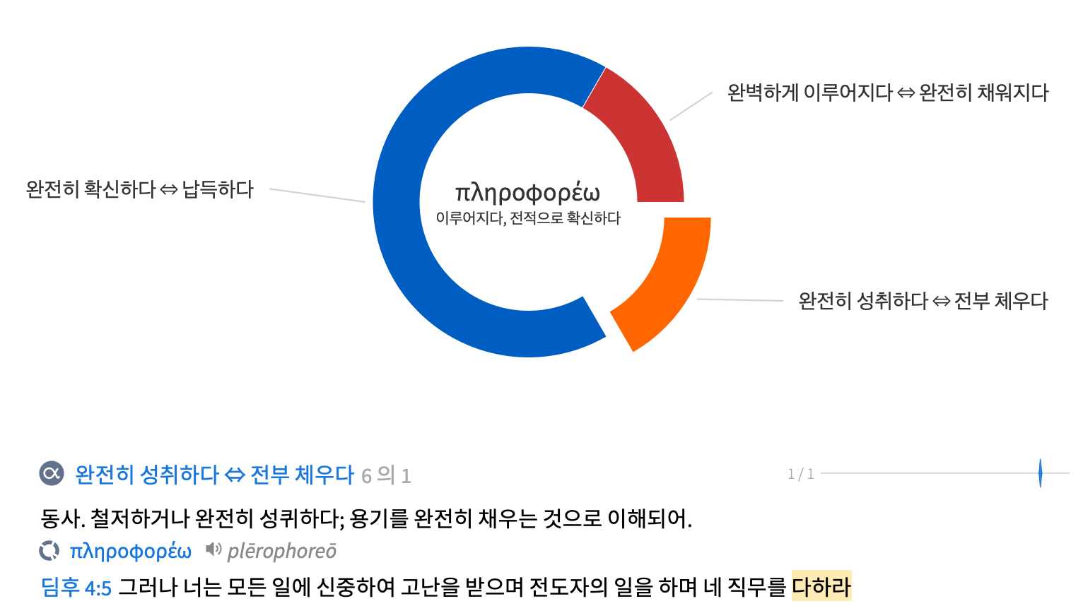 ‘직무’로 번역된 ‘디아코니안’의 원형 ‘디아코니아’는 ‘봉사’를 의미하는 신약의 주요한 표현으로 그리스도의 몸인 교회의 덕을 세우기 위해 필요한 교육이나 심방 등 제반의 봉사 활동을 지칭한다. 주요한 영역본들은 이를 목회 사역을 의미하는 ministry로 번역하였다. ‘다하라’라는 표현은 ‘플레로포레손’으로 ‘가득하다, 충만하다’라는 의미의 형용사 ‘플레레스’와 ‘지다, 운반하다, 참다’라는 의미의 동사 ‘페로’의 합성어로 ‘충만하게 가지다, 완전하게 성취하다’란 매우 강한 의미인 ‘플레로포레오’의 부정 과거 능동태 명령형 표현이다. 즉 바울은 매우 강한 명령의 의미를 지닌 표현을 사용하여 적극적으로 이 일을 이루어야 함을 강조하고 있다. 이는 마치 용기를 가득 채우는 모습을 연상시킨다.