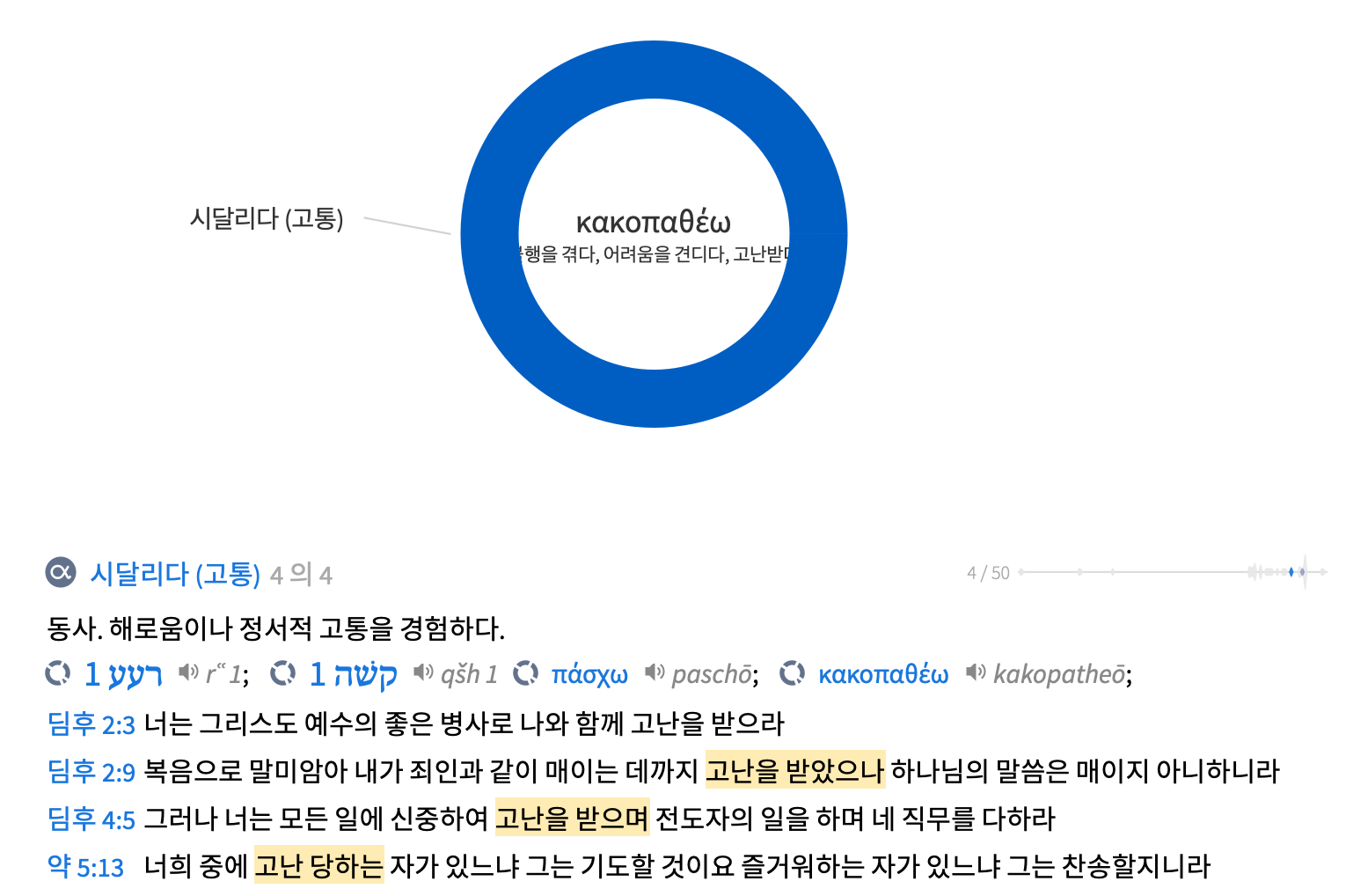 ‘고난을 받으며’로 번역된 ‘카코파데손’은 ‘카코파데오’의 부정 과거 명령형이다. 앞서 1:8과 2:3에도 이러한 표현이 나온다. 이 단어는 ‘나쁘게, 흉악하게’라는 표현인 ‘카코스’와 ‘경험하다, 겪다, 고생하다’를 의미하는 동사 ‘파스코’의 합성어로 ‘불행을 겪다, 어려움을 견디라’라는 의미를 지닌다. 바울은 거짓 선생과 구별되는 바른 목회자의 특징이 바로 고난 받는 것임을 분명히 인식하고 있었고 이를 디모데에게 분명하게 전달하고 있는 것이다.