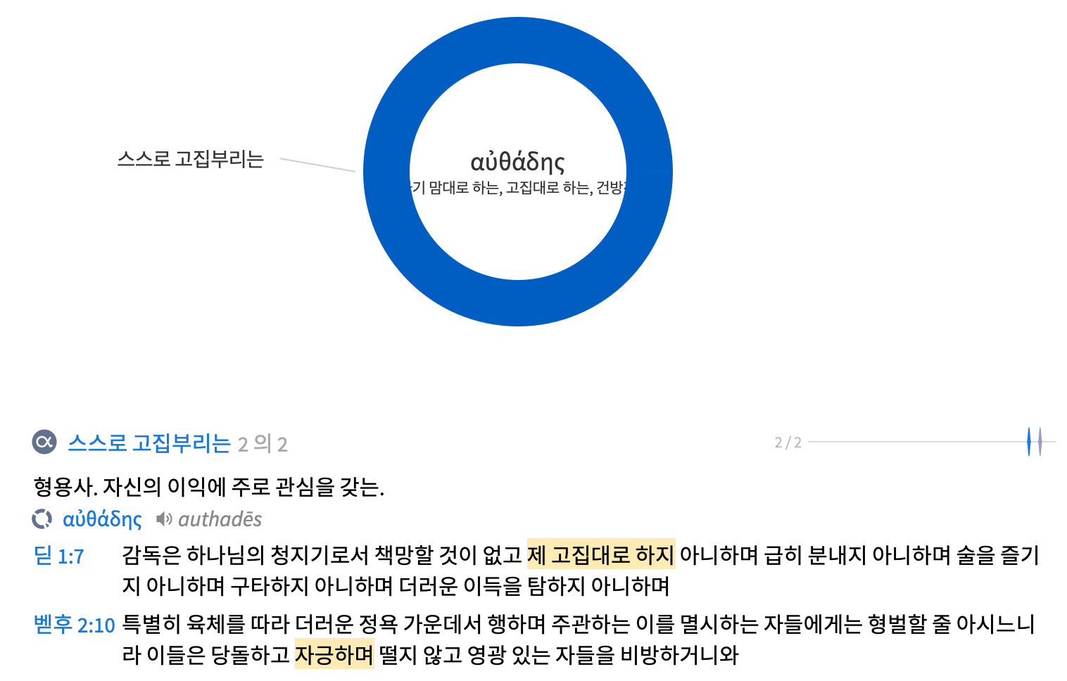 ‘제 고집대로 하지 아니하며 급히 분내지 아니하며’, ‘제 고집대로 하다’라는 표현은 ‘아우다테’로 ‘자기 자신’을 의미하는 ‘아우토스’와 ‘기쁘게 하다’를 의미하는 ‘헤도마이’의 합성어로 ‘자기를 기쁘게 하는, 자기 만족의, 제멋대로의, 독단적인’이라는 의미이다. 감독은 항상 두 곳을 향해 자신의 귀를 열어놓고 있어야 한다. 첫째는 하나님의 뜻, 즉 성령의 세미한 음성이고 둘째는 성도들의 소리이다.