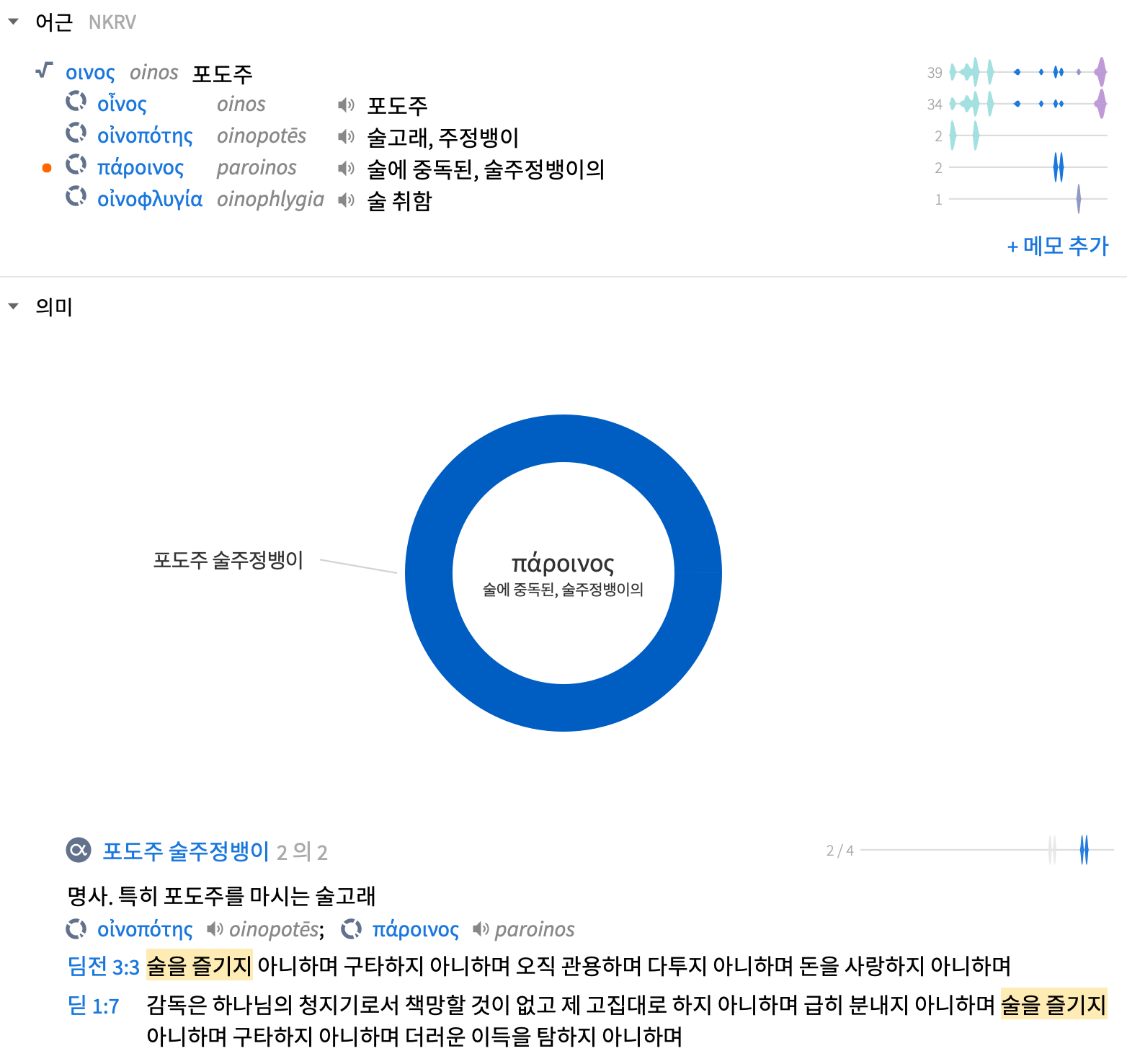 ‘술을 즐기지 아니하며 구타하지 아니하며’, ‘술을 즐기지’로 번역된 ‘파로이논’의 원형 ‘파로이노스’는 ‘~곁에’를 의미하는 전치사 ‘파라’와 ‘포도주, 포도원, 음료’의 뜻을 갖는 명사 ‘오이노스’의 합성어로 문자적으로는 ‘포도주 곁에 오래 앉아 있는’이란 의미로 ‘포도주에 빠진, 술취한’이라는 의미를 갖는다. 술을 즐기지 않는다는 것을 술에 지나치게 취하여 말다툼을 하거나 추태를 부리지 않는 것을 말한다. 딤전 3:8에서는 술에 인박이지 말아야 한다고 말했다. 술 취한 자의 해악에 대해서는 잠 23:29-35절을 보라.