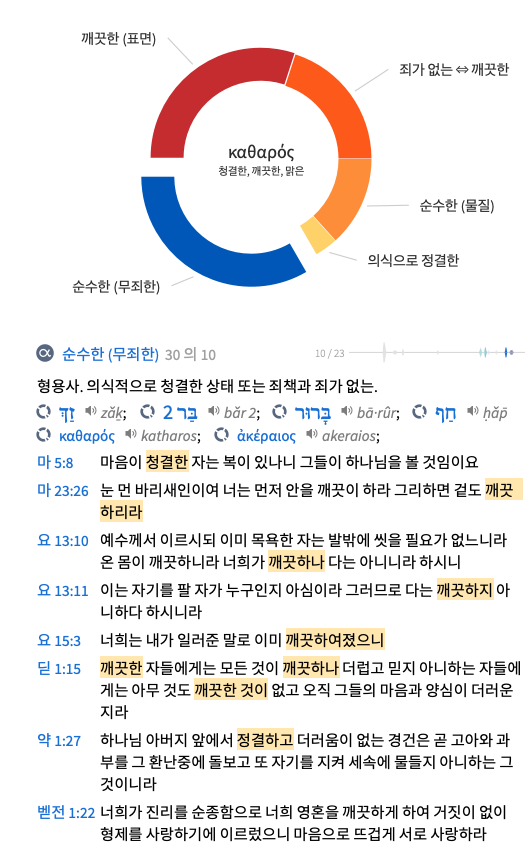 15절) ‘깨끗하나’로 번역된 ‘카다라'의 원형 ‘카다로스’는 물리적으로 ‘정제된’, 종교적으로는 ‘정결한’, 윤리적으로는 ‘죄가 없는, 더러운 욕구가 없는’이라는 의미를 가진다. 본절에서는 이 단어가 두번 사용되는데 ‘카다라’는 레위기에 나오는 율법의 의미로 아무런 불결함도 주지 않는다는 의미이며(레 14:20) ‘카다로이스’는 그리스도의 구속의 은혜로 정결케 된 사람들이란 의미이다. 본문은 그리스도의 의로 깨끗함을 임은 자들에게는 모든 마음이 깨끗하게 여겨진다는 의미이다.