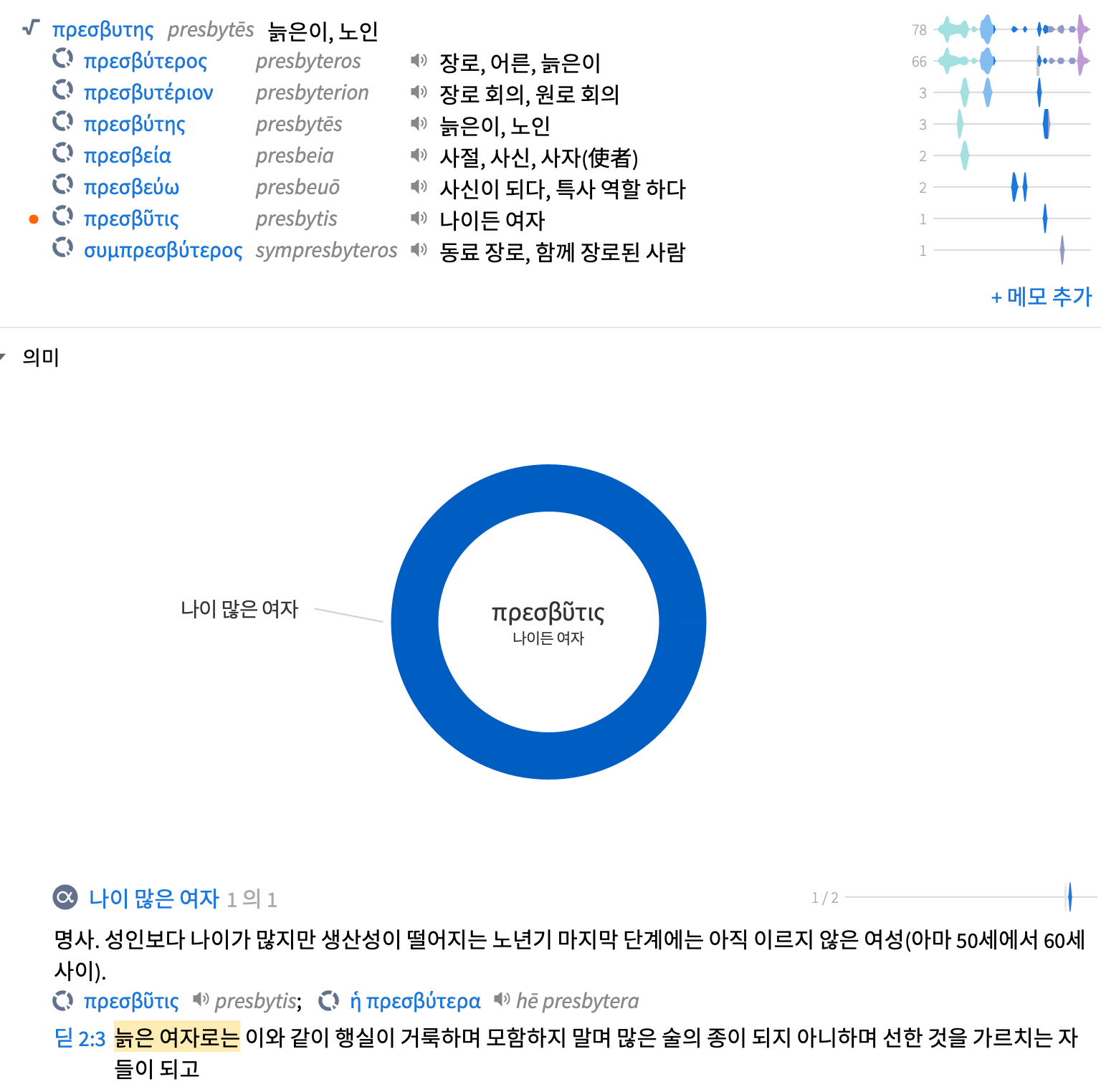 3절) ‘늙은 여자’로 번역된 ‘프레스뷔티다스’는 2절에서 ‘늙은 남자, 프레스뷔테스’의 여성형으로 ‘나이가 많은 여자’를 의미한다. 본문에서 ‘이와 같이’로 번역된 ‘호사우토스’는 ‘꼭 그렇게, 똑같이’라는 의미의 부사로 바울이 늙은 남자들에게 말한 덕목들 늙은 여자들도 똑같이 행하여 행실을 거룩하게 해야한다는 것을 의미하는 표현이다.