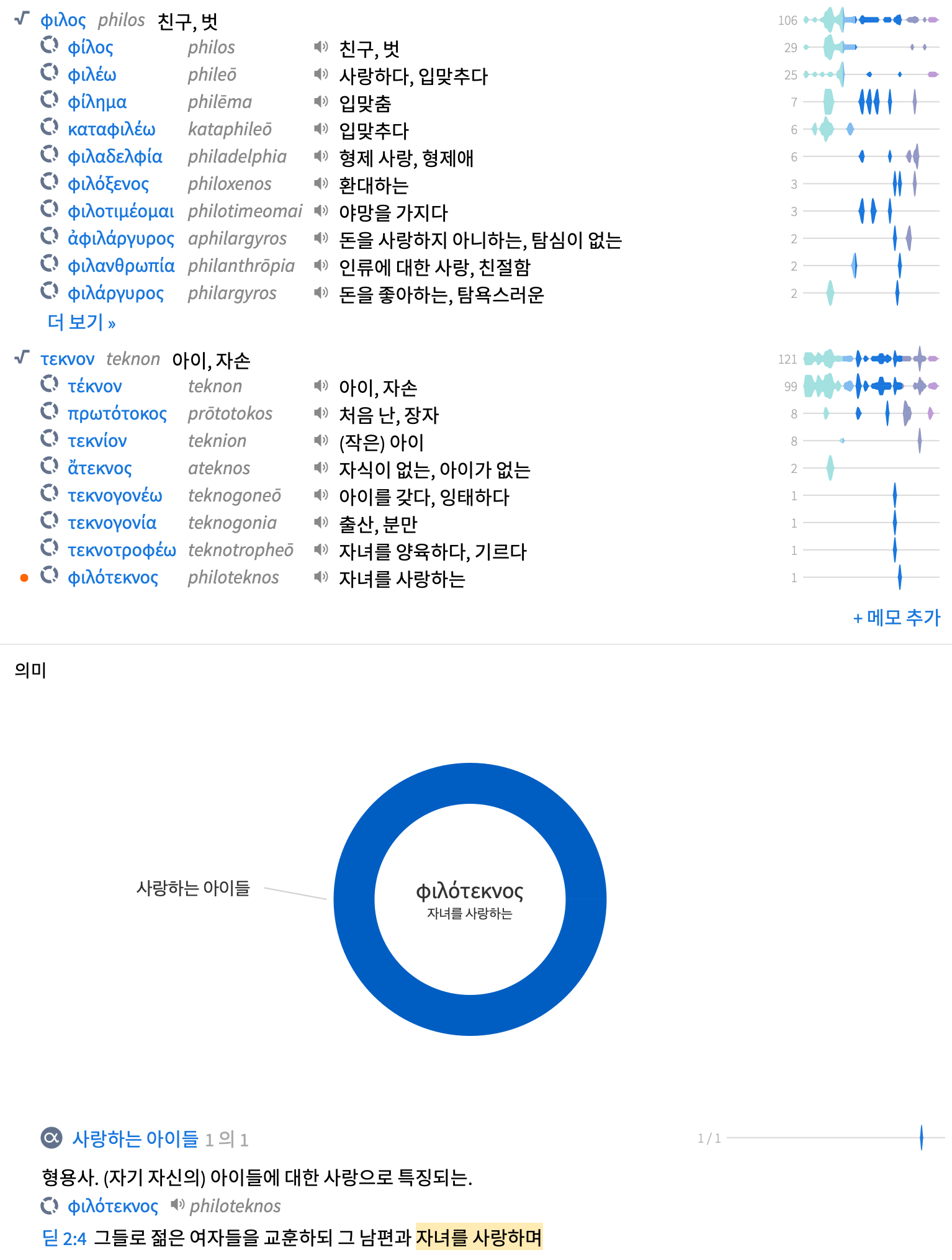 ‘그 남편과 자녀를 사랑하며’, 본문을 다시 번역하면 ‘그 남편들을 사랑하고, 그 자녀들을 사랑하도록’이 된다. ‘필란드로스’는 ‘사랑하다’라는 의미의 ‘필로스’와 ‘남편, 남자’를 뜻하는 ‘아네르’의 합성어로 ‘남편을 사랑하는’이라는 의미이다. ‘필로테크노스’도 ‘필로스’와 ‘자녀’를 뜻하는 ‘테크논’의 합성어로 ‘자녀를 사랑하는’이라는 의미이다. 일반적으로 종교적 사랑을 말할때는 의지가 강조되는 ‘아가파오’를 사용했고 정서적인 면이나 친구나 동료간의 사랑을 아나탤 때에는 ‘필레오’를 사용한다.