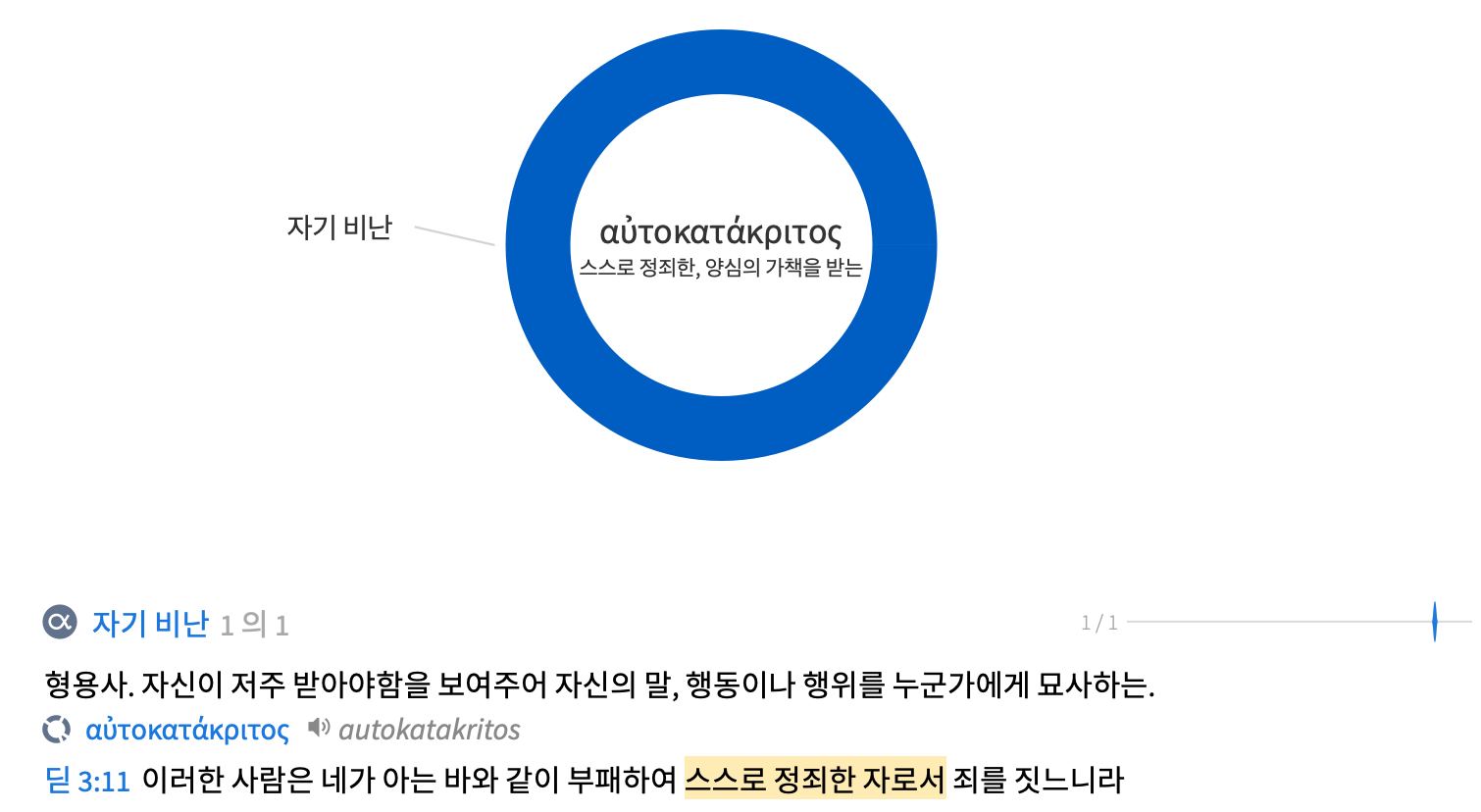 ‘스스로 정죄한’으로 번역된 ‘아우토카타크리토스’는 ‘자기 자신의’란 의미의 ‘아우토스’와 ‘정죄하다, 고소하다’라는 의미의 동사 ‘카타크리노’의 합성어로 ‘스스로 정죄한, 스스로 유죄판결을 받은’이라는 의미이다. 스스로 죄를 짓고 진리에서 떠난 것을 알면서도 의도적으로 죄를 짓는 상태에서 벗어나지 않고 도리어 이를 즐기는 상태를 말한다. 이들은 이미 진리에서 떠나 돌이키기 어려운 자들로 바울은 이들을 멀리하라고 말한다.