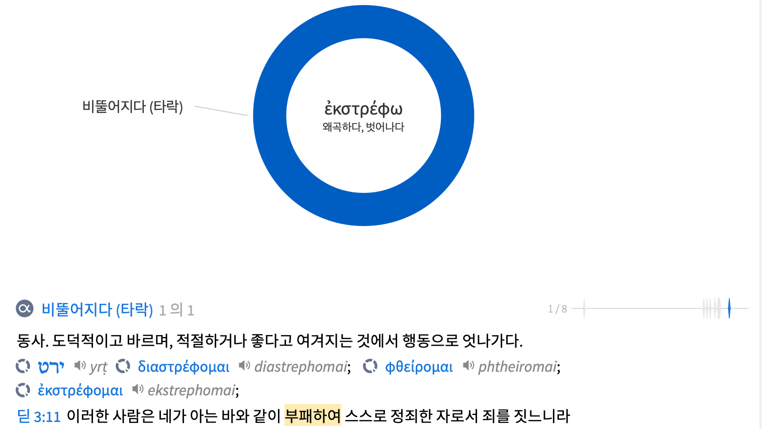 ‘부패하여’로 번역된 ‘엑세스트리타이’의 원형 ‘윽스트레포’는 ‘~밖으로’라는 의미의 분리를 나타내는 전치사 ‘에크’와 ‘돌이키다, 향하다, 변하다’라는 의미의 동사 ‘스트레포’의 합성어로 ‘나쁜 쪽으로 변하다, 악화되다, 나쁜 길에 빠지다’라는 의미이다. 이는 완료형으로 사용되어서 이미 그런 상태에 빠졌고 그 상태가 지속되고 있음을 보여준다.