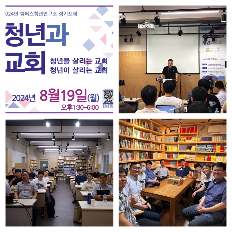 지난 8월 19일 학원복음화협의회 산하 캠퍼스청년연구소에서 진행하는 ‘청년과 교회’라는 포럼을 진행했습니다. 부제를 ‘청년을 살리는 교회, 청년이 살리는 교회’로 잡았습니다. 저는 연구위원으로 함께 주제를 선정하고 함께 논의할 질문들을 선정하는 작업을 함께 했습니다. 기조발제는 느헤미야의 배덕만 교수님이 진행해 주셨고, 여러 연구위원들의 세부 발제가 있었습니다. 발제 내용은 첨부한 자료를 참고해주세요.