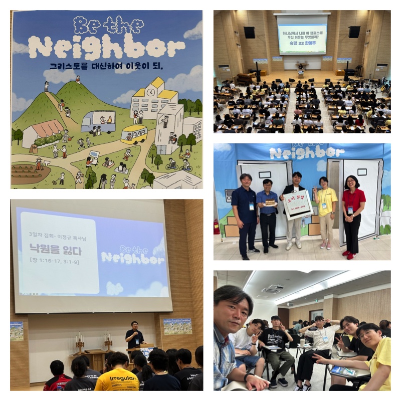 이번 여름 수양회는 ‘Be the Neighbor-이웃이 되’라는 주제로 진행되었습니다. 저는 목요일 주제 중에 ‘삶의 자리에서 이웃이 되’라는 세션에서 각자 아직 복음의 의미를 바로 알지 못하는 이들에게 복음을 설명하고 나누는 시간을 가졌습니다. 역시 젊은 학생들과의 시간은 저의 가슴을 뛰게 합니다. 함께 찬양하고 말씀을 듣고 기도하는 시간을 통해서 모두가 좋은 이웃으로 살아가기를 기대합니다.