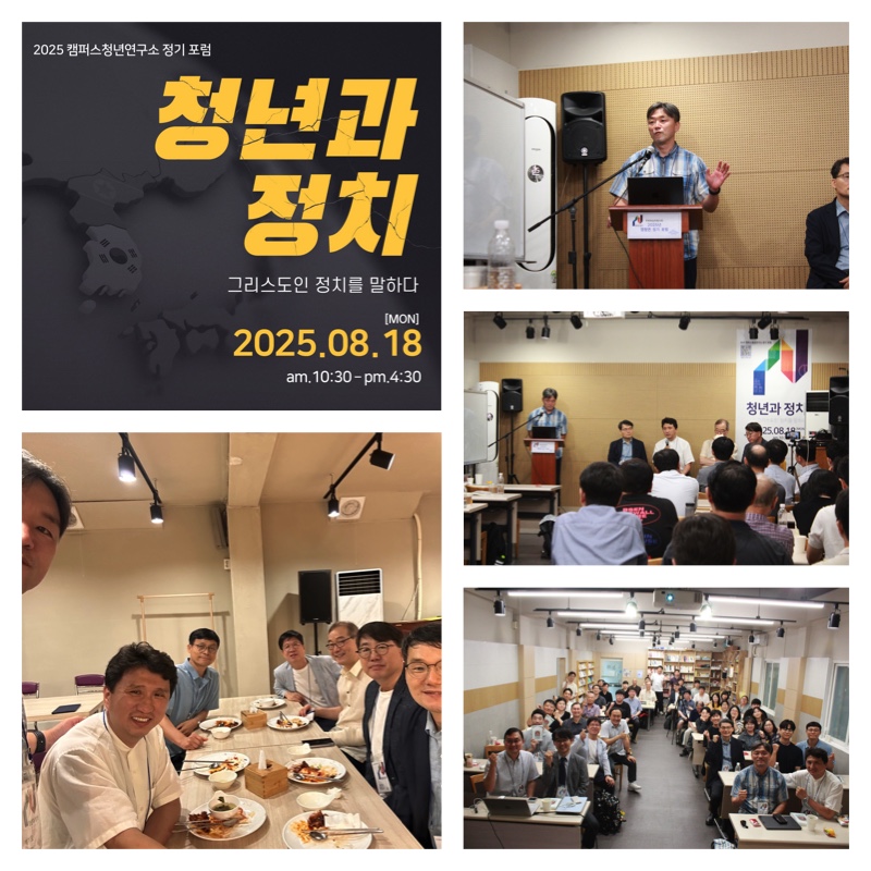 이번 포럼의 주제는 ‘청년과 정치’였습니다. 지난 계엄과 탄핵정국을 거치며 교회가 이념에 의해서 나눠지며 힘겨운 시간들을 보냈습니다. 교회 공동체 안에서 건강하게 정치에 대한 주제가 토론되지 못하는 현실을 보면서 쉽지 않지만 이런 주제를 공론의 장으로 가져와야 한다는 연구위원들의 의견을 모아서 이번 포럼을 진행하게 되었습니다. 청년들의 현실과 정치와 관련된 여러 성경의 가르침들, 정교분리의 원칙, 교회와 선교단체에서 20대 청년들이 겪는 어려움 등 실제적인 여러 가지 이야기들을 듣고 나누는 시간이었습니다. 저는 청년연구위원으로 포럼 자료집을 수정하고 패널토의 사회를 맡아서 함께 했습니다. 아래 포럼 자료집을 첨부합니다. 참고하시길 바랍니다.