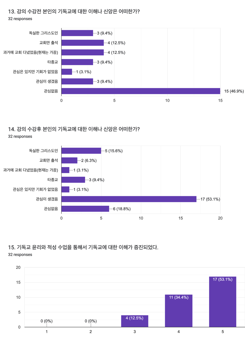 이번 학기 동안 좋은 강의를 들을 수 있어 감사했습니다. 기독교 수업이 단순한 지식 전달이 아니라 제 삶을 되돌아보게 하는 시간이 되었습니다. 앞으로도 학생들이 편하게 질문하고 생각을 나눌 수 있는 수업 분위기를 계속 이끌어주시면 좋겠습니다. 감사합니다.