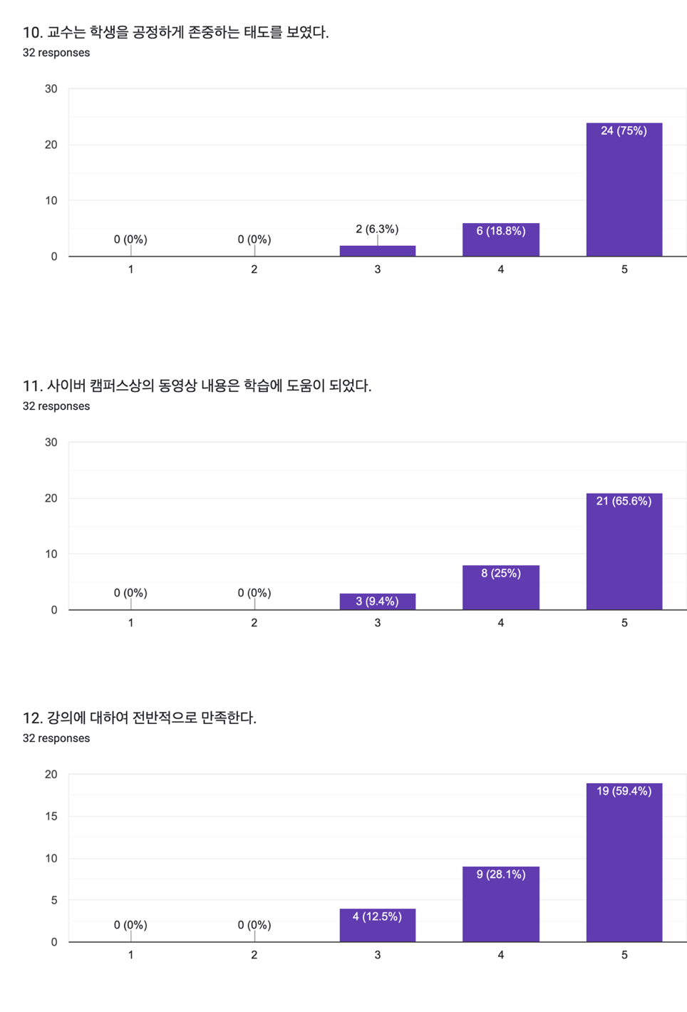 교수님도 학기동안 수고 많으셨습니다. 특히 조별로 자신만의 생각을 나누는 활동이 마음에 들었습니다.