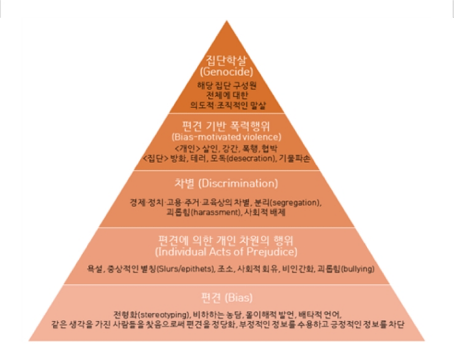 혐오의 피라미드 : 편견 -> 혐오표현 -> 차별 -> 증오범죄 -> 집단학살 84