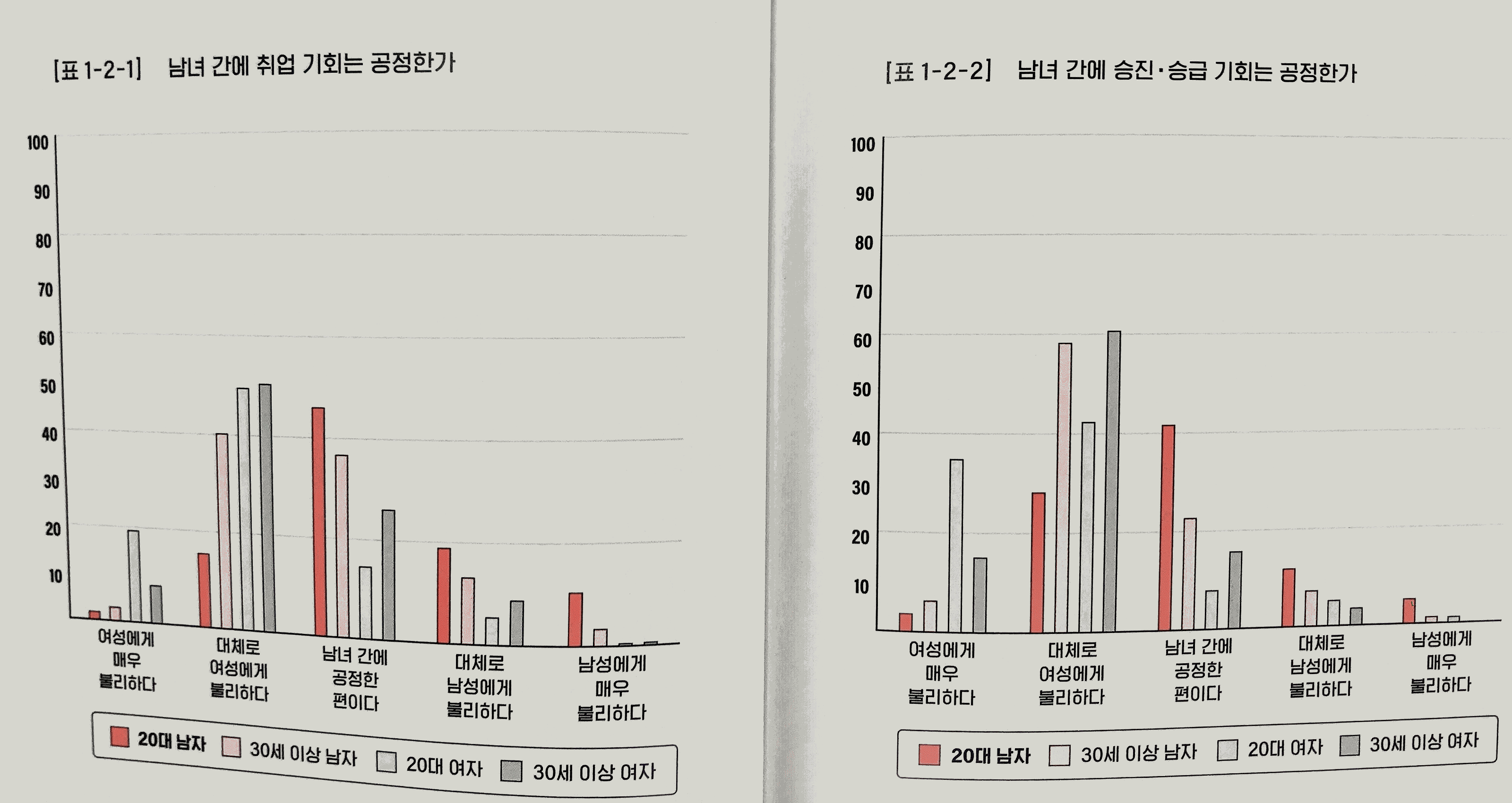 “남녀 간에 취업 기회는 공정한가?”라는 질문에 대부분 여성에게 불리하다는 인식이 다수인 반면에 20대 남자들의 경우 공정한 편이다가 45.9%이고 도리어 남성에게 불리하다가 29.2%, 여성에게 불리하다가 16.9%로 역전된다. 마찬가지로 “남녀 간에 승진-승급 기회는 공정한가?”라는 질문에 대해서도 20대 남자를 제외하고 여성에게 불리하다라고 대답한 반면에 20대 남자들은 공정한 편이다라는 응답이 41.5%에 달하고 남성에게 불리하다라는 응답도 16.8%에 달한다.