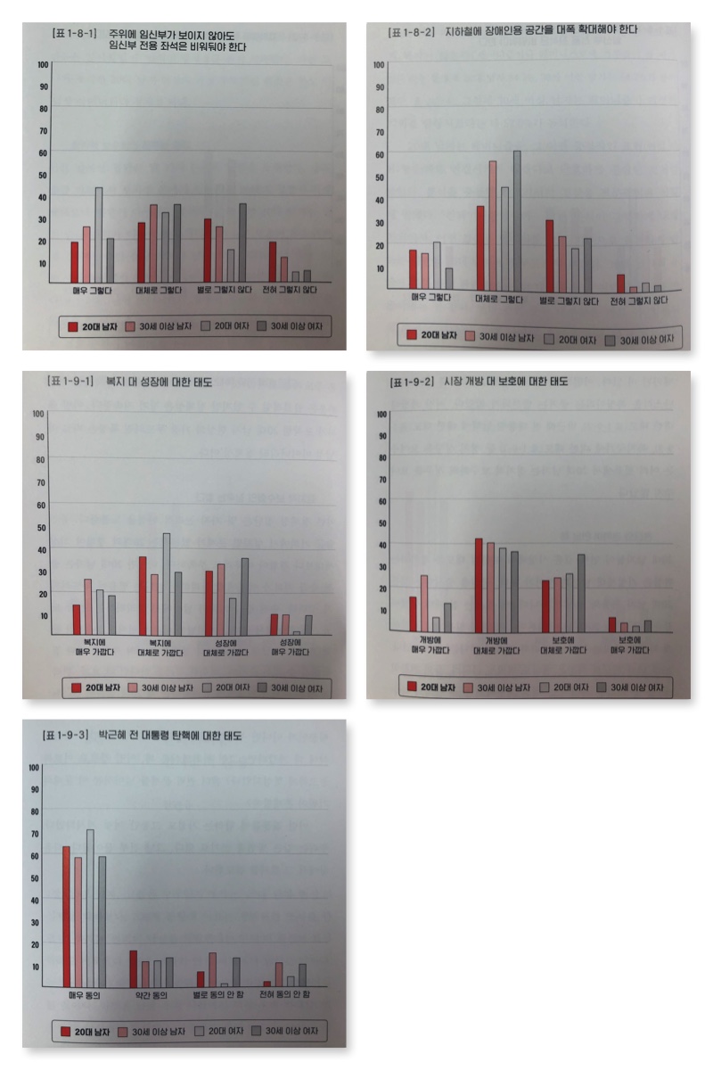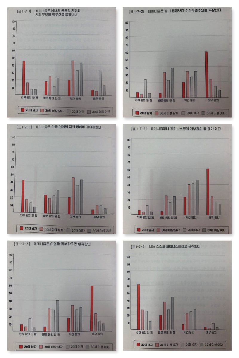 복지대 성장, 시장 개방, 박근혜 대통령 탄핵에 대한 태도를 묻는 질문을 통해서 20대 남자가 유별나게 보수화되었다는 의견은 들어맞지 않는다. 20대 남자의 여론이 일관되게 유일하고 뚜렷하게 차이를 보이는 분야는 바로 ‘젠더와 권력이 만나는’ 영역이었다.