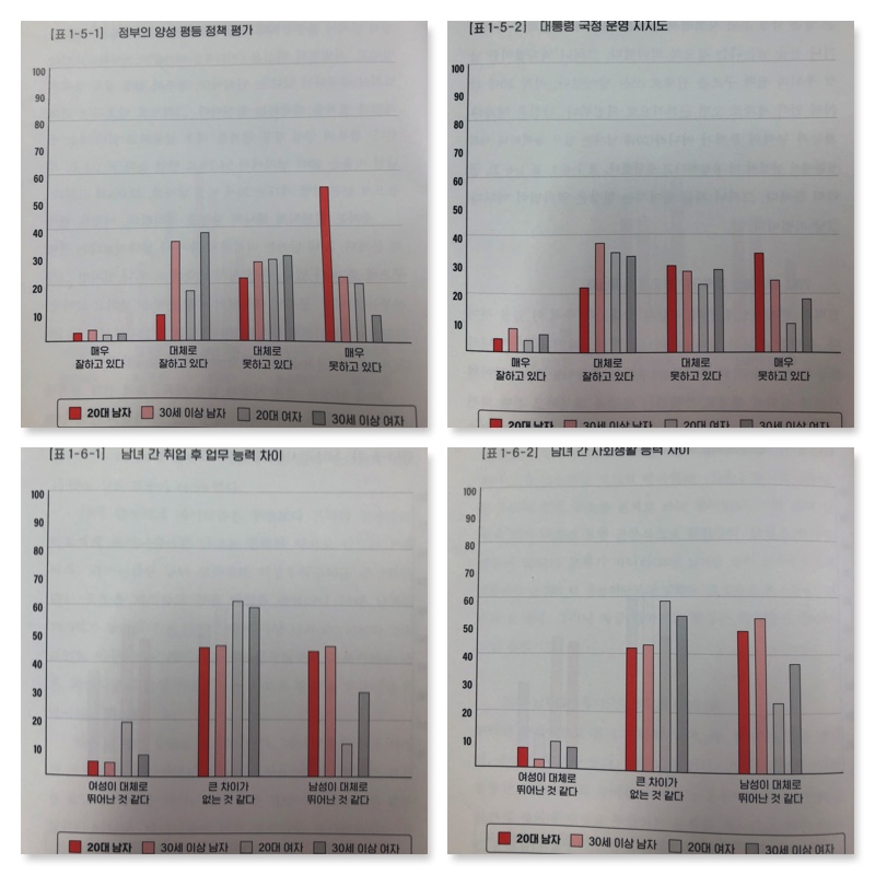 20대 남자들의 경우 압도적으로 정부의 양성 평등 정책에 대해서 못하고 있다는 평가가 75.7%에 이른다. 게임의 법칙을 주관하는 권력인 정부에 대해서 매우 못마땅하게 여기고 있는 것이다. 이는 대통령의 국정 지지도에서도 나타난다. 20대 여자는 대통령이 못하고 있다는 의견이 32.7%인데 20대 남자는 62.9%이다. 남녀 간 취업 후 업무 능력을 묻는 질문에서 '남성이 대체로 뛰어난 것 같다’라는 항목에 대해서 20대 남자는 43.8%, 20대 여자는 11.6%로 그 간극이 크게 나타남을 알 수 있다.