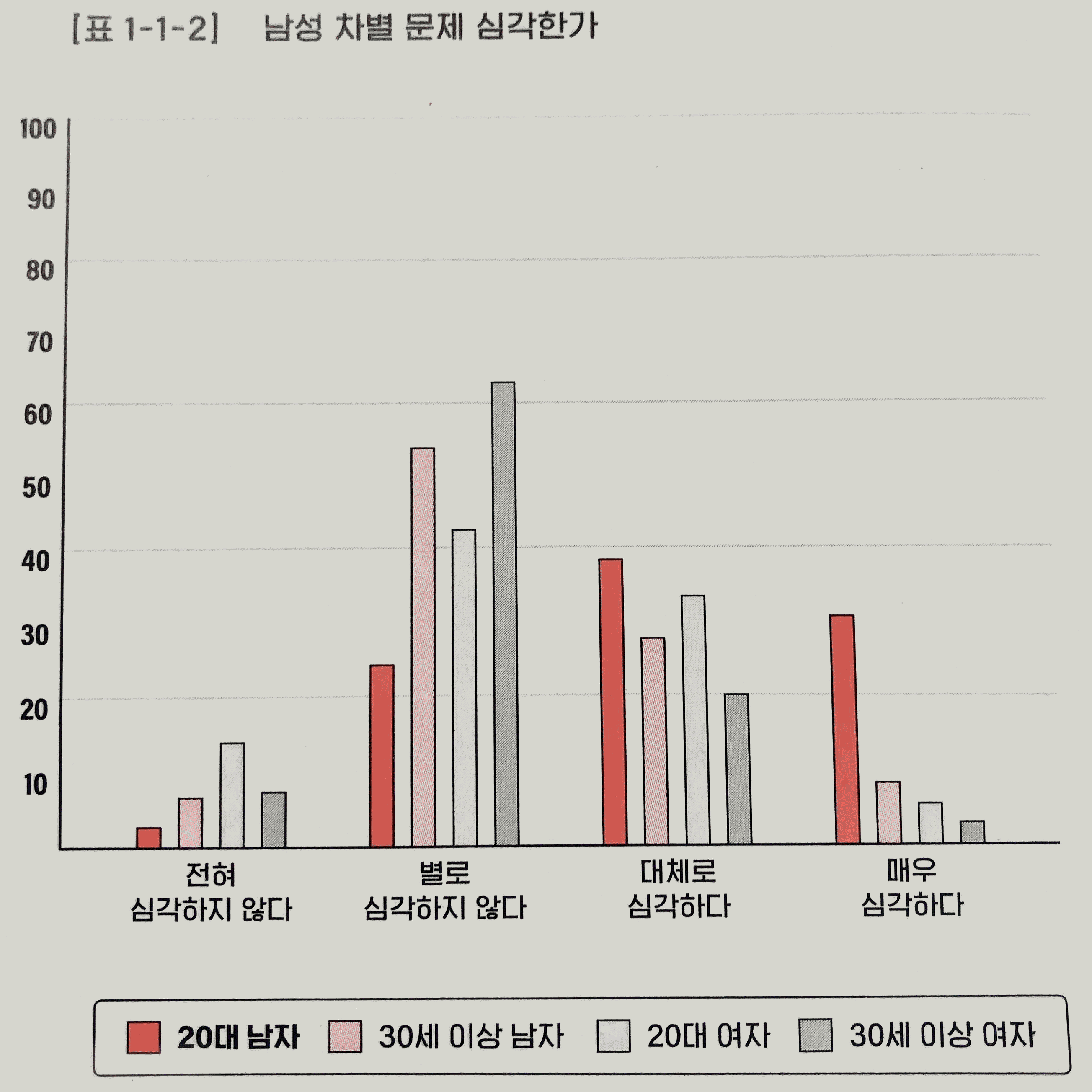 2019년 시사인에서 실시한 “20대 남자 그들은 누구인가”라는 조사 결과에 의하면 ‘남성 마이너리티 정체성 집단’의 비율이 25.9%에 달한다고 발표했다. 이렇게 페미니즘에 극단적으로 반대하는 20대 남성들이 바로 PC(Political Correctness, 정치적 올바름)에 대해 부정적인 태도를 표하고 있는 것이다. 임홍택의 ‘90년생이 온다’에서는 90년생의 특징을 ‘간단, 재미, 정직’으로 표현했다. 정직이라고 표현된 이 특징은 공정이라고 표현하는 것이 더 적절하다고 생각한다. 이중에 25.9%에 해당하는 남자들의 집단은 초⦁중⦁고 교육과정과 대학 입시에서는 여성들이 더 뛰어나다고 생각하지만 취업 이후 업무능력과 사회생활에서는 남성이 압도적으로 더 유능하다고 여긴다. 이 과정에서 취업 시에 여성들에게 특혜를 주는 정책에 대해서 절대적으로 동의하지 않는다고 말했다. 이들에게 취업시 여성 할당 정책은 불의와 불공정의 상징으로 여겨지는 것이다. 4명중에 1명에 해당하는 20대 남자들의 이러한 반페미니즘 정서는 PC(Political Correctness, 정치적 올바름)에 반대하는 입장에 잇닿아 있고 이는 젊은 남성들이 극우로 편향되는 것과 무관하지 않다. 본 책에서 주장하고 있는 내용을 좀더 자세하고 보도록 하자.
