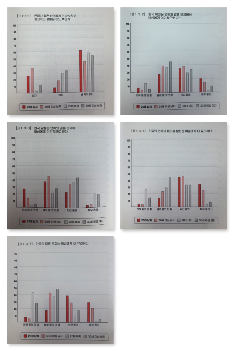 연애와 결혼이 ‘여성에게 더 유리한 게임’이라는 문제에 대해서(표 1-3-5) 20대 여성은 9.7% 동의한데 반하여 20대 남성은 66.3%가 동의한다. 20대 남자들은 여성에 대해서 보다 결혼 문화, 게임의 규칙이 더 마음에 들지 않는 것이다.