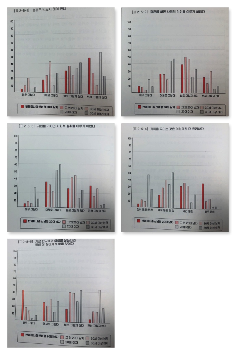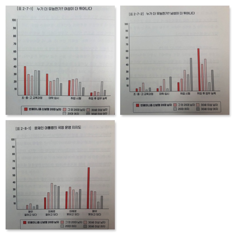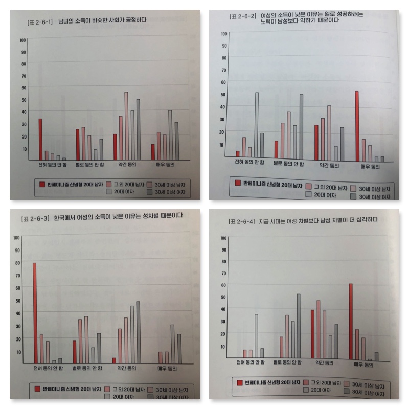위 여섯개의 문항중에 1-3번 문항에 대해 전혀 동의 안함, 4-6번 문항에 대해서 매우 동의를 표시한 20대 남자들의 비율이 25.9%에 해당한다. 이들은 -12점에 해당하는 확고한 페미니즘 반대자로 본 주제에서 주목하는 ‘남성 마이너리티 정체성 집단’이다.