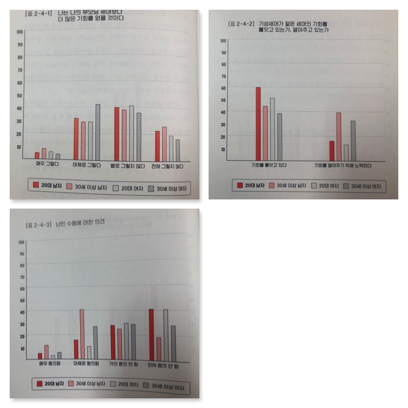 ‘기성세대가 절은 세대의 기회를 빼앗고 있는가, 열어주고 있는가’라는 질문(표 2-4-2)에 대해서 20대 남자는 59.5%가 기회를 빼앗고 있다라고 응답한다. 난민 수용에 대한 질문은 20대 남자와 20대 여자가 공히 다른 세대에 비해서 반대하는 비중이 큰 것을 알 수 있다. 저성장과 기회 축소로 인한 불안이 20대 남자 현상의 토대가 된 것이다.