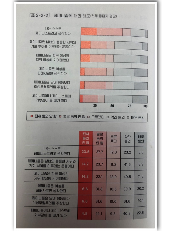 본 조사의 백미에 해당하는 부분은 바로 20대 남자들 중에 ‘반페미니즘 정체성 집단’ 25.9%가 어떻게 나왔느냐 하는 것이다. 그것은 아래의 질문에 대한 응답을 통해 나왔다.