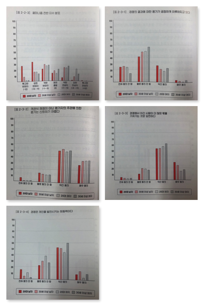 20대 남자 현상에 대한 설명으로 이들이 공정성에 유난히 민감하고 불공정에 대해 반대하는 성향이 크며 경쟁의 가치를 높이 평가한다고 말한다. 하지만 이는 20대 남자만이 가지는 특징은 아니다. ‘경쟁의 결과에 대한 평가가 공정하게 이루어지고 있다’라는 질문(표 2-3-1)에 동의하지 않는 응답은 전체 평균 71.9%인데 20대 남자는 65.1%로 도리어 낮다. 객관식에 대한 질문이나 경쟁에 대한 태도를 묻는 질문도 평균과 크게 차이를 보이지 않는다. 말하자면 공정과 경쟁은 차이를 만들어내지 않는다는 것이다. 하지만 이 과정에서 젠더 이슈가 포함되면 그 답변은 달라진다.