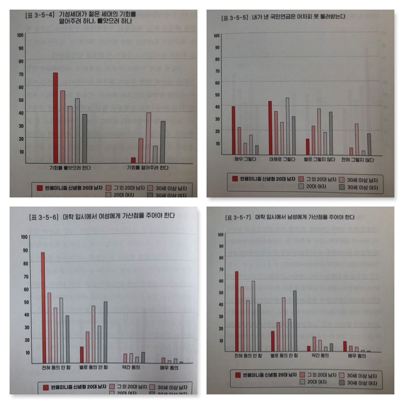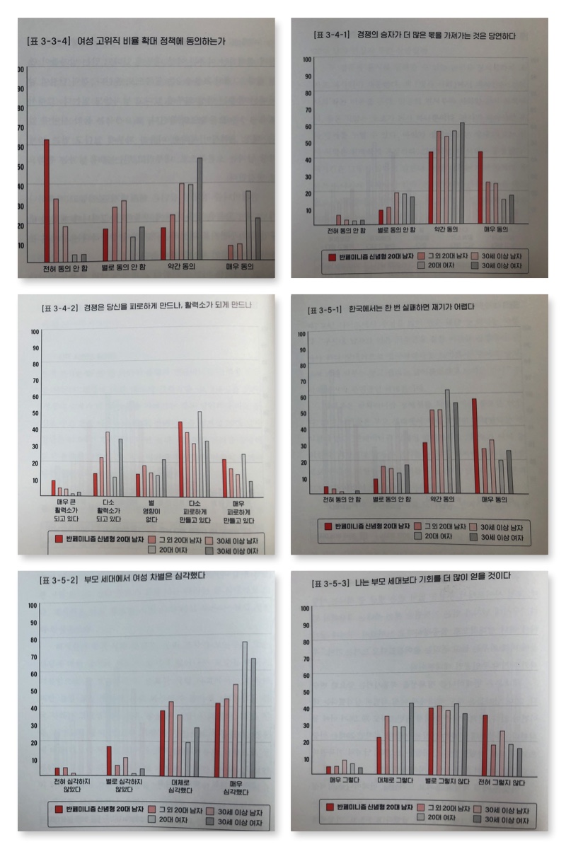 취업시 여성할당 정책에 대해서는 압도적으로 반대하는데 이러한 정책은 그들에게 불의와 불공정의 상징이다. 하지만 육아로 인한 여성 경력단절 보상에 대해서는 64%가 동의하는 것으로 보아서 덮어놓고 여성 혐오는 아니다.