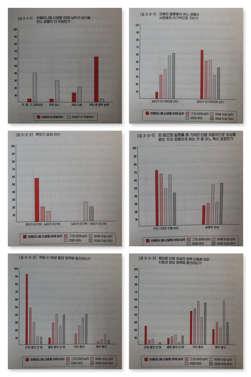 반페미니즘 신념형 20대 남자들이 보기에 초중고 교육 과정이나 대학입시, 취업 시험까지는 여성이 더 유능하다고 답하지만 취업후 업무능력에서는 남성이 더 유능하다고 압도적으로 응답한다.