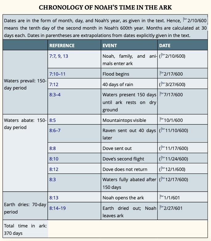 2-5절) 깊음의 샘과 하늘의 창문이 닫히고 하늘에서 비가 그치매 물이 땅에서 물러가서 150일 후에 줄어들었다. 일곱째달 17일에 방주가 아라랏 산에 머물렀고 이후 물이 점점 줄어들어 열째 달 1일에 산들의 봉우리가 보이기 시작했다.