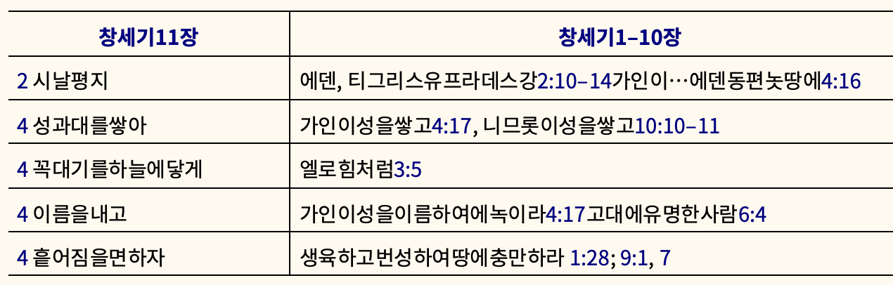 - 창세기 11:5–9은 창세기 11:1–4에 사용된 표현들을 교차대구법과 반복법을 통해 강조한다. 매튜가 분류한 표는 이를 아주 잘 보여 준다.14)