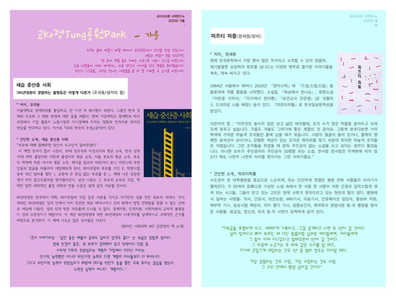 사역연구소에서 진행한 다양한 연구 내용을 소식지로 배부했습니다. ‘고정공원으로의 초대‘ 이외에 연구소에서 스터디한 내용이나 함께 고민해야할 이슈, 연구 자료들을 정리해서 직원예배를 통해서 간사들에게 나누고 이후 원하는 분들에게는 PDF나 웹진 형태로 나누려고 합니다.