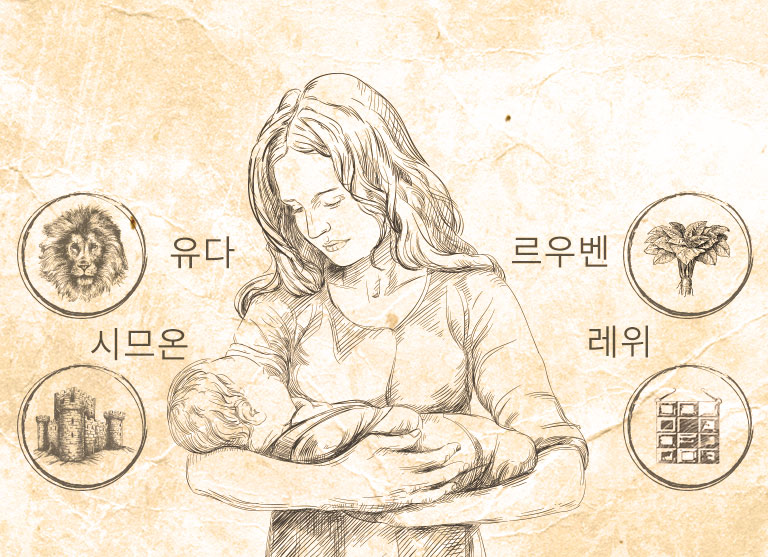 32) 첫째 아들 르우벤 : '보라 아들이다'. 레아는 이 아이의 이름에 주님께서 나의 고통을 살피시고 나에게 아이를 주셨다라는 의미를 부여했다.