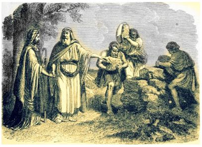 이에 야곱이 이삭의 하나님, 이삭이 경외하는 이를 가리켜서 이를 맹세하고 산에서 제사를 드리고 형제들을 불러 떡을 먹이고 함께 산에서 밤을 지냈다. 그리고 라반이 아침에 일찍 일어나 손자들과 딸들에게 입맞추며 그들에게 축복하고 고향으로 돌아갔다.