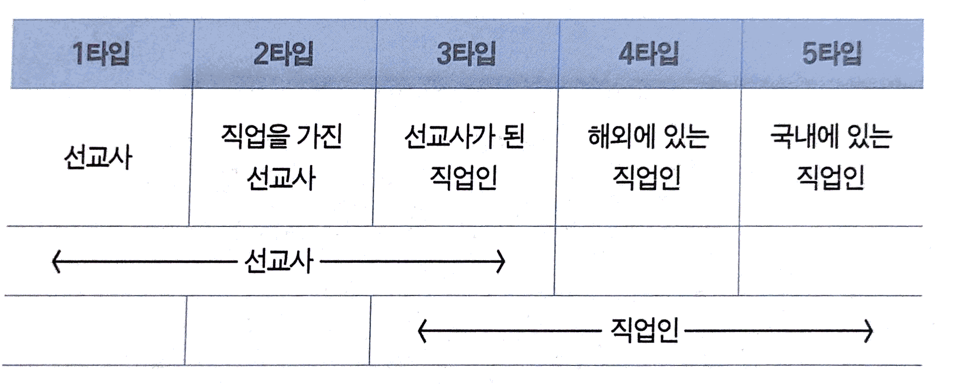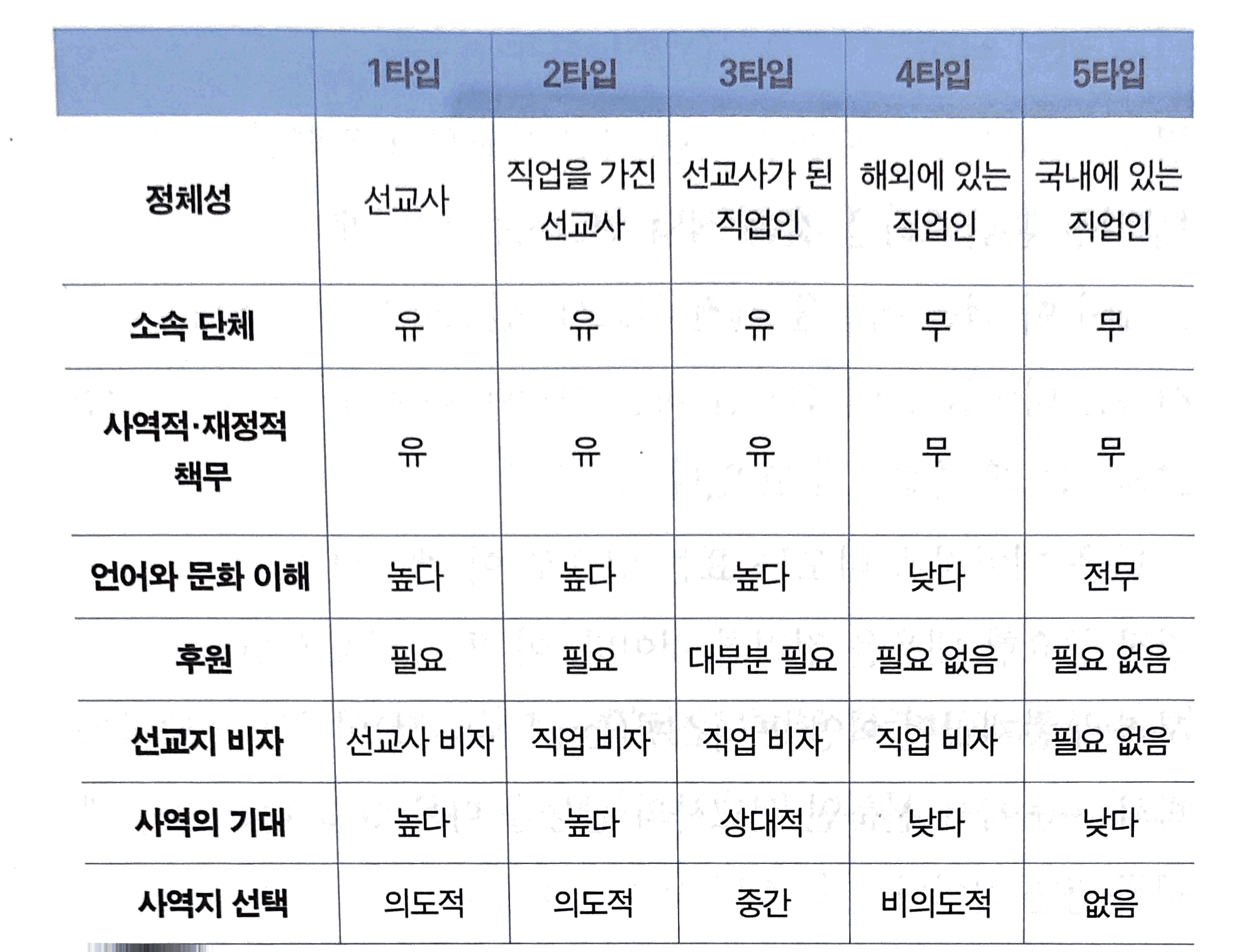 2타입은 자신을 선교사라고 생각한다. 한편 3타입은 원래 직업인이었다. 따라서 3타입은 2타입과 달리 선교사와 직업인의 이중적 정체성을 갖는다.