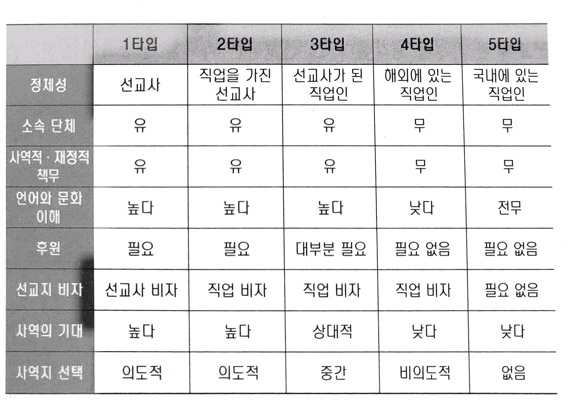 - 선교사의 지위 : 필드 사역, 본부 사역, 휴직, 병가, 사직, 은퇴, 공부를 위한 휴직